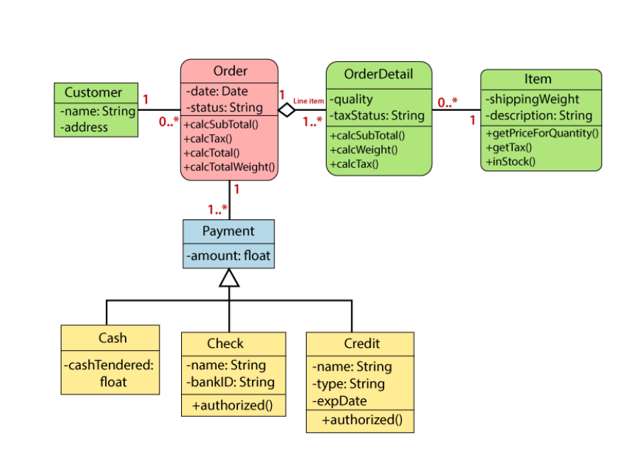 class Customer class Order class OrderDetail class Item class Payment class Cash : Payment class Check : Payment class Credit : Payment