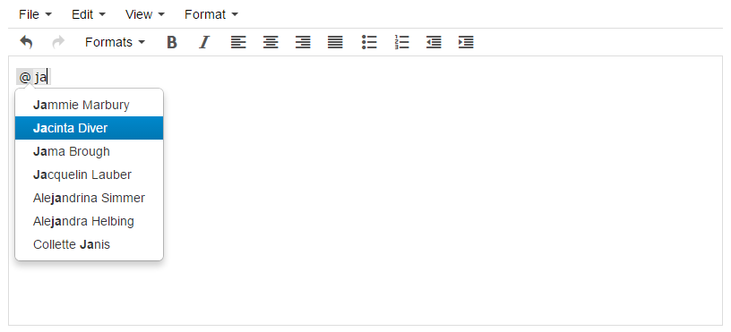 Mention/Autocomplete plugin for tinyMCE WYSIWYG editor.