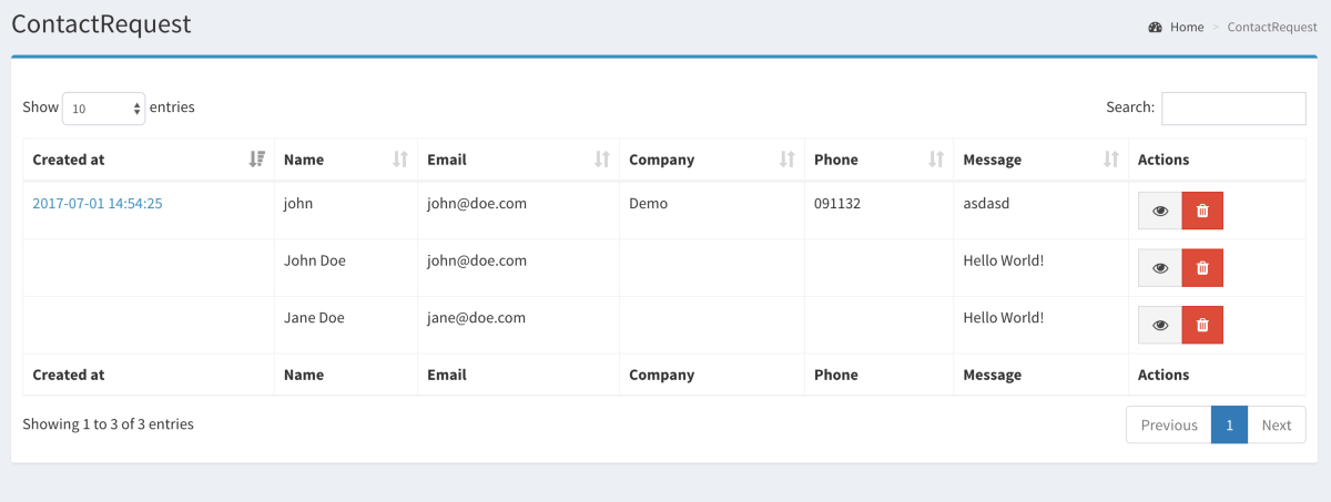 Comes with a basic contact form with name/email/company/phone/message fields. Contact requests are displayed on the backend.
