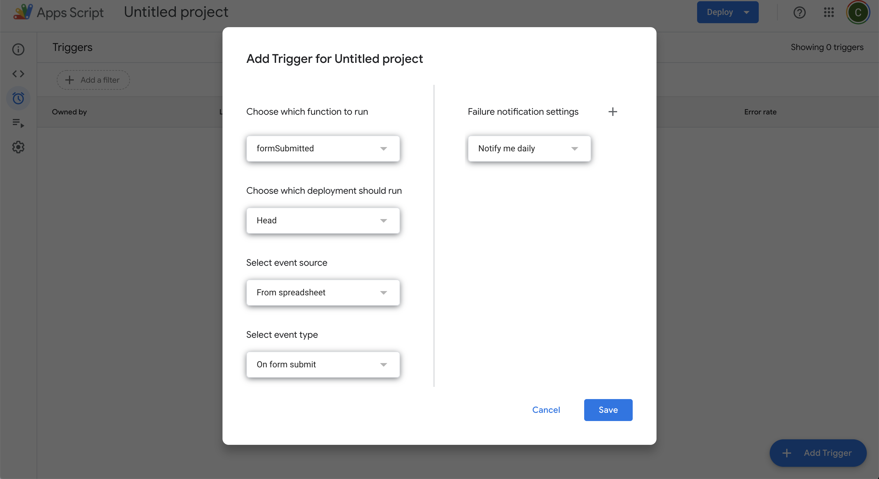 - On the left menu, go to Triggers. In the bottom right, press Add Trigger. Make the function Add Trigger, the event type On form submit, and the failure notification settings how often you want emails. Press save: when the popup appears, click your own account, and when it says "Google hasn’t verified this app" with an angry red triangle, press the small "Advanced" text on the bottom left and then click the underlined "Go to (project name) (unsafe)"