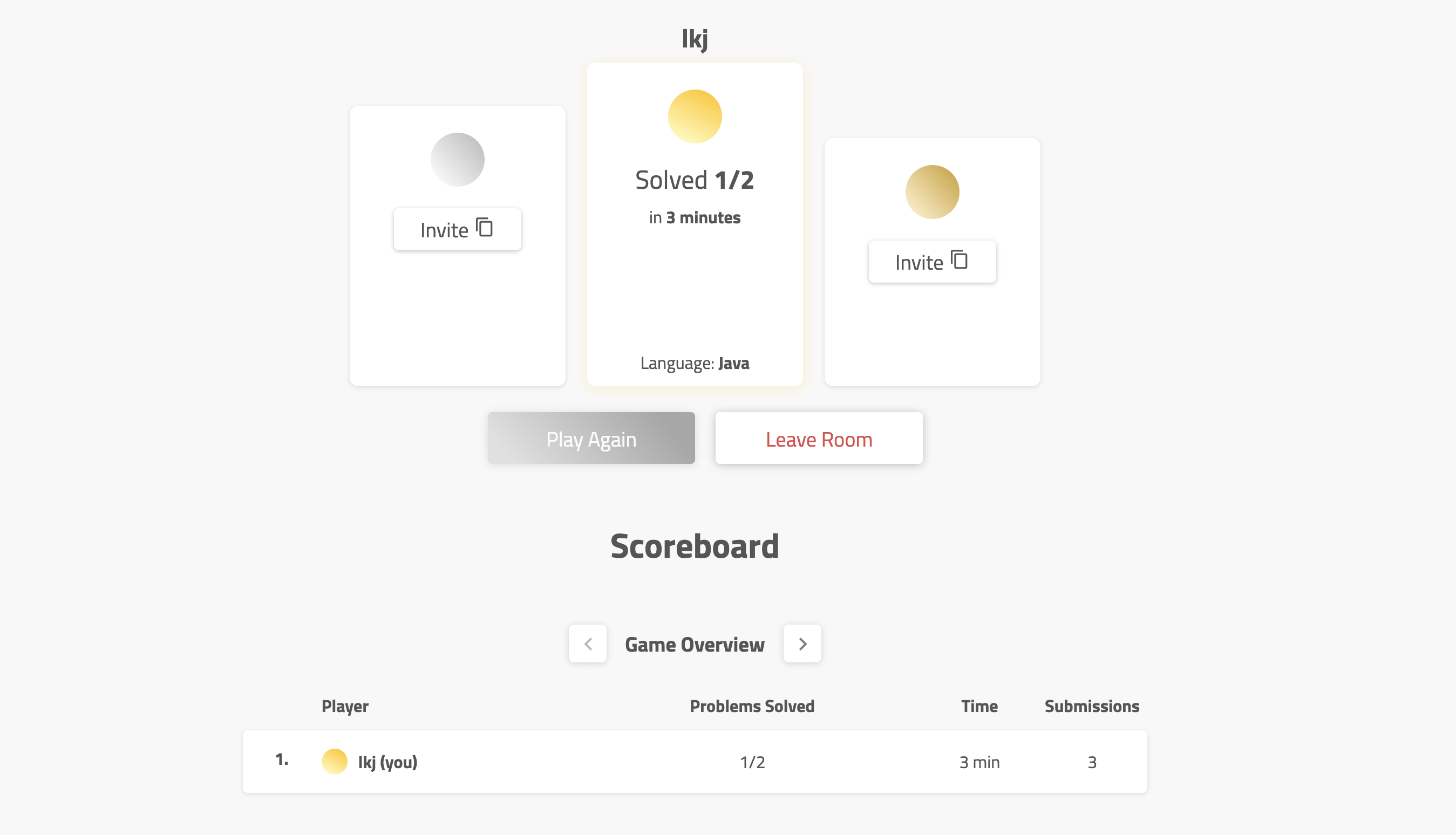 2/5->3/5rather than40%->60%when correctly solving a problem - however, I'm open to feedback on this if there are any better options out thereWhen first entering spectate mode, it fetches theEDIT: I implemented the new solution, so now it should work without issues :)defaultCodeListwhich takes a short while - this also means that it initially will show only the latest submitted code for each problem until the player types something to update it. I felt like this was the most efficient option, although this is a clear downside, so I may look into alternatives (e.g. sending the full code list when first subscribing as mentioned in standup).Screencast and Images: