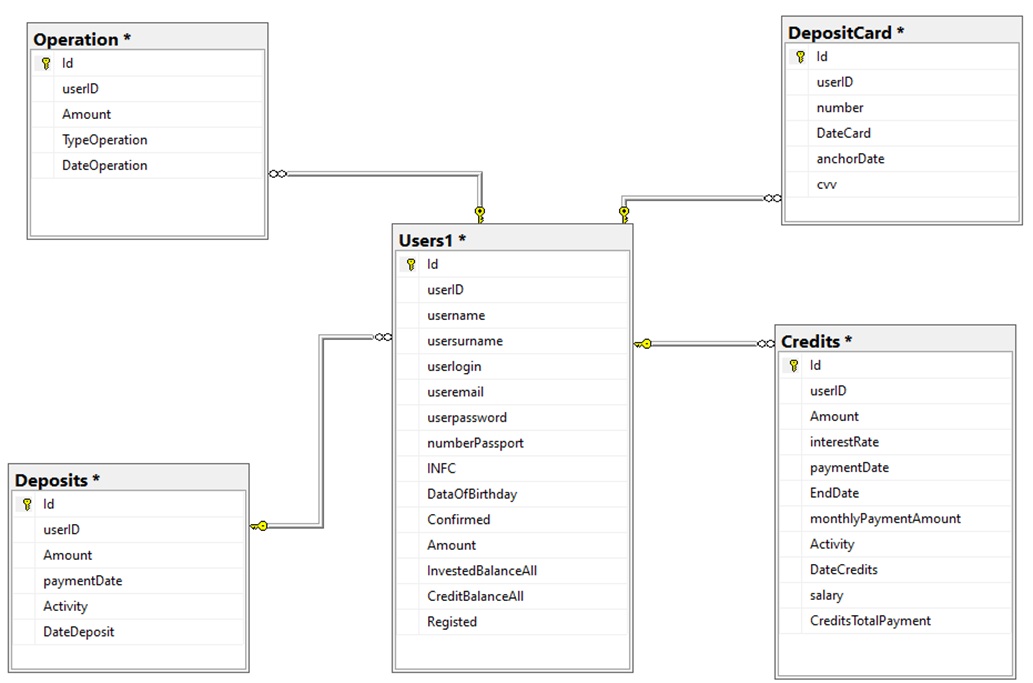 Исходя из исследования предметной области, можно выделить следующие сущности разработки: клиент, депозитная карта, кредитные данные, пользователь, операции, вклады, кредиты. Для сущности «Клиент» можно выделить следующие атрибуты: