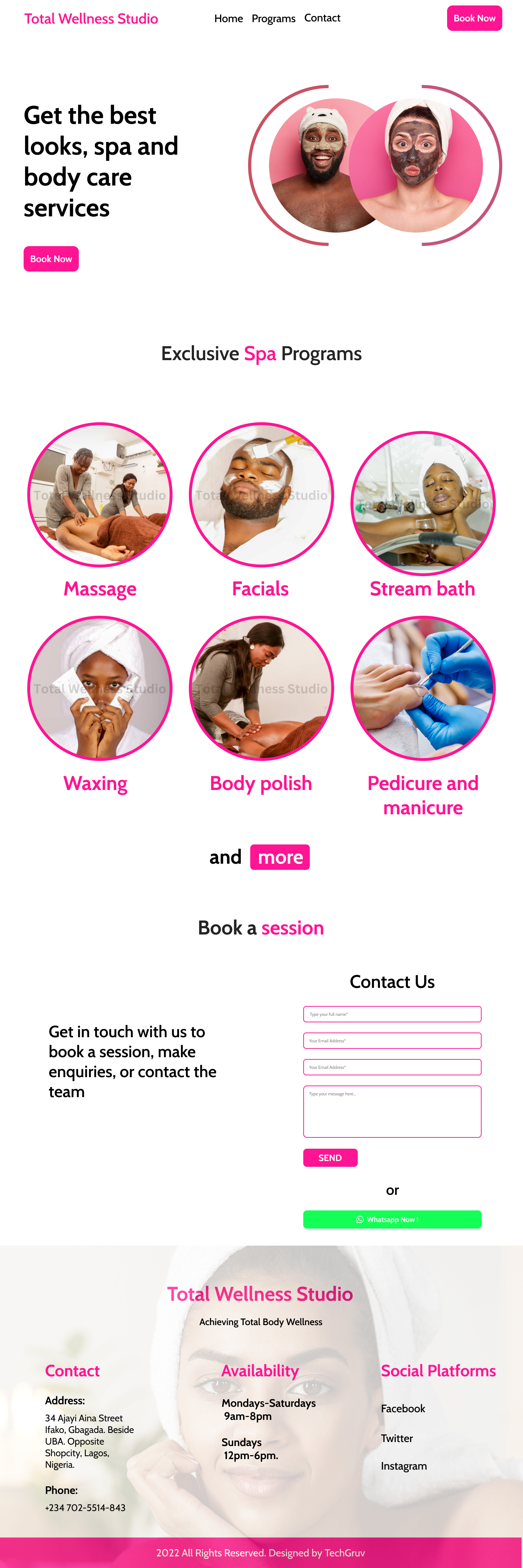 Total Wellness Studio Landing Page A Spa website Using HTML, CSS, JS. Check out the site here: Total Wellness Studio.
