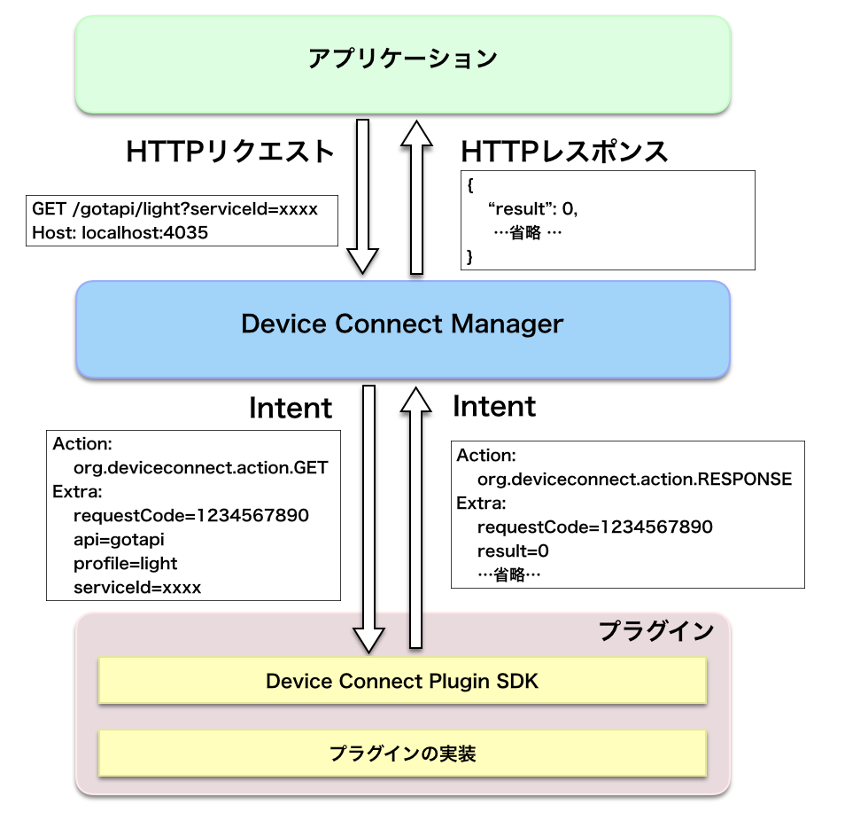 Device Connect Managerは、HTTPリクエストで受信した命令を、Intentに変換して、各プラグインに配送します。