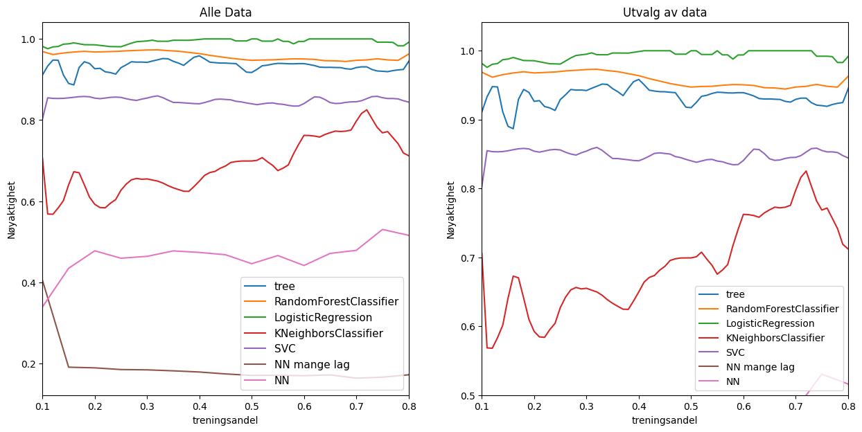 En interessant ting å observere er hvordan modellene håndterer å ha lite treningsdata. Noen av modellene, som logistisk regresjon, fungerer bra stort sett uansett hvor mye trenings data den har. SVC presterer litt dårligere, men den er stabil uansett mengden data. KNabo klassifisering er mer ustabilt og for å få en god modell er det veldig viktig å har riktig mengde data. RandomForestClassifier som blir dårligere med for mye data viser tydelig at det ikke alltid er bedre med mer data.