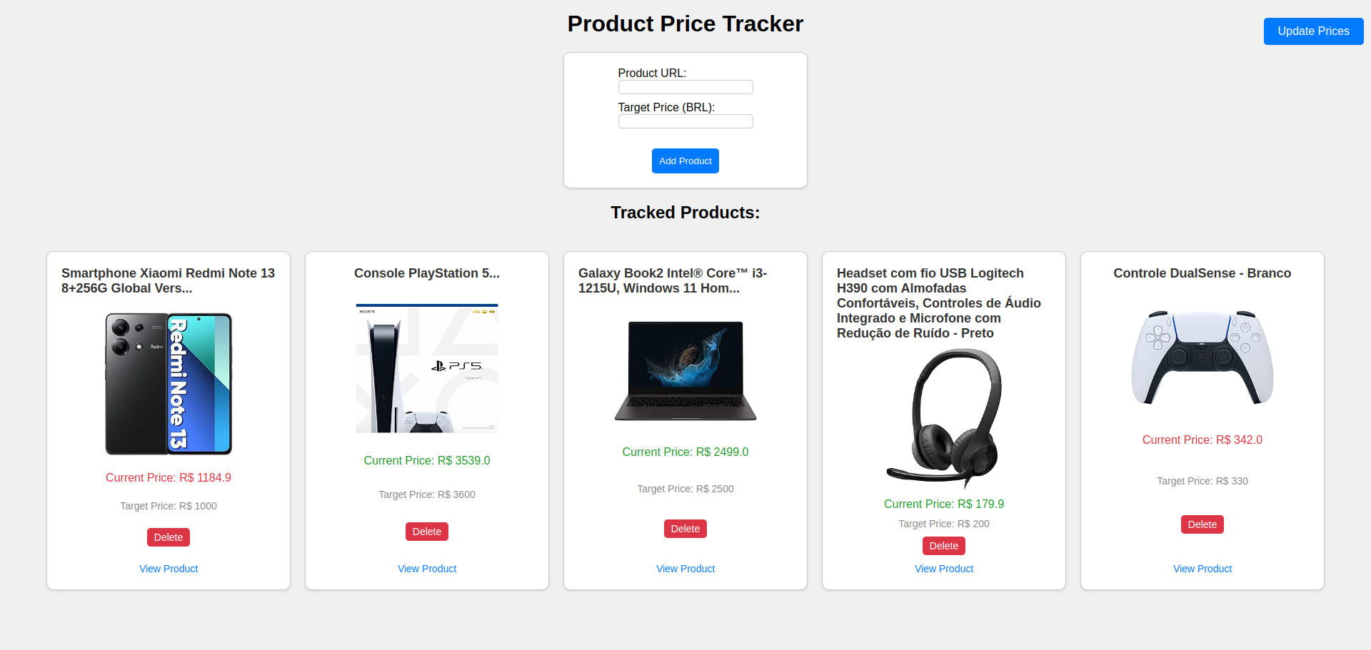 - Adicionar produtos para rastreamento, informando o URL e o preço-alvo de cada produto.
