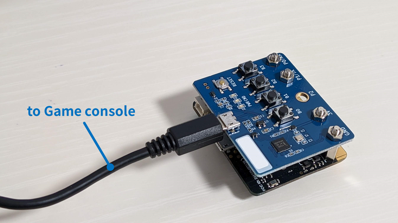 Reset switchを押します.初期化が正常になされるとされるとLED-CMDが点滅します(3度).- ホストマイコンから本製品を通じて,ゲームコンソールへと制御信号を送ります.