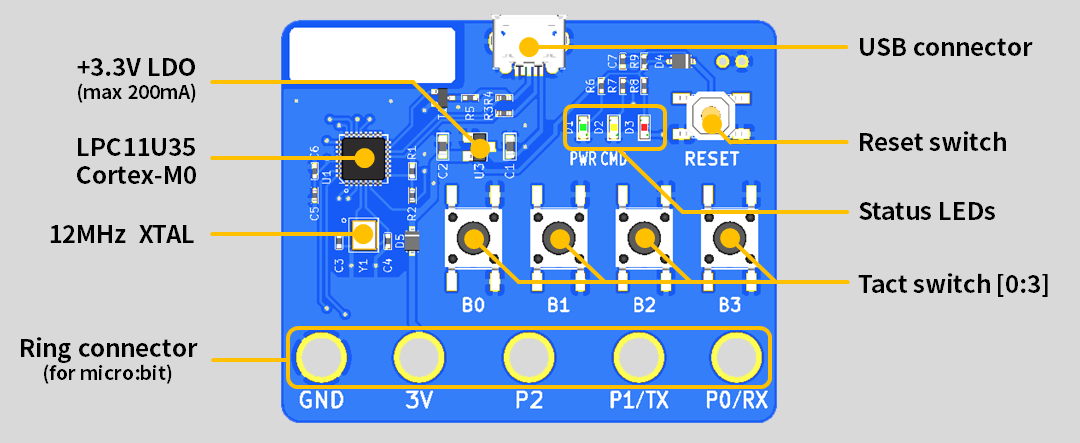 - Tact switch[0:3] : ライブラリと組み合わせることで外部ボタンとして利用できます.