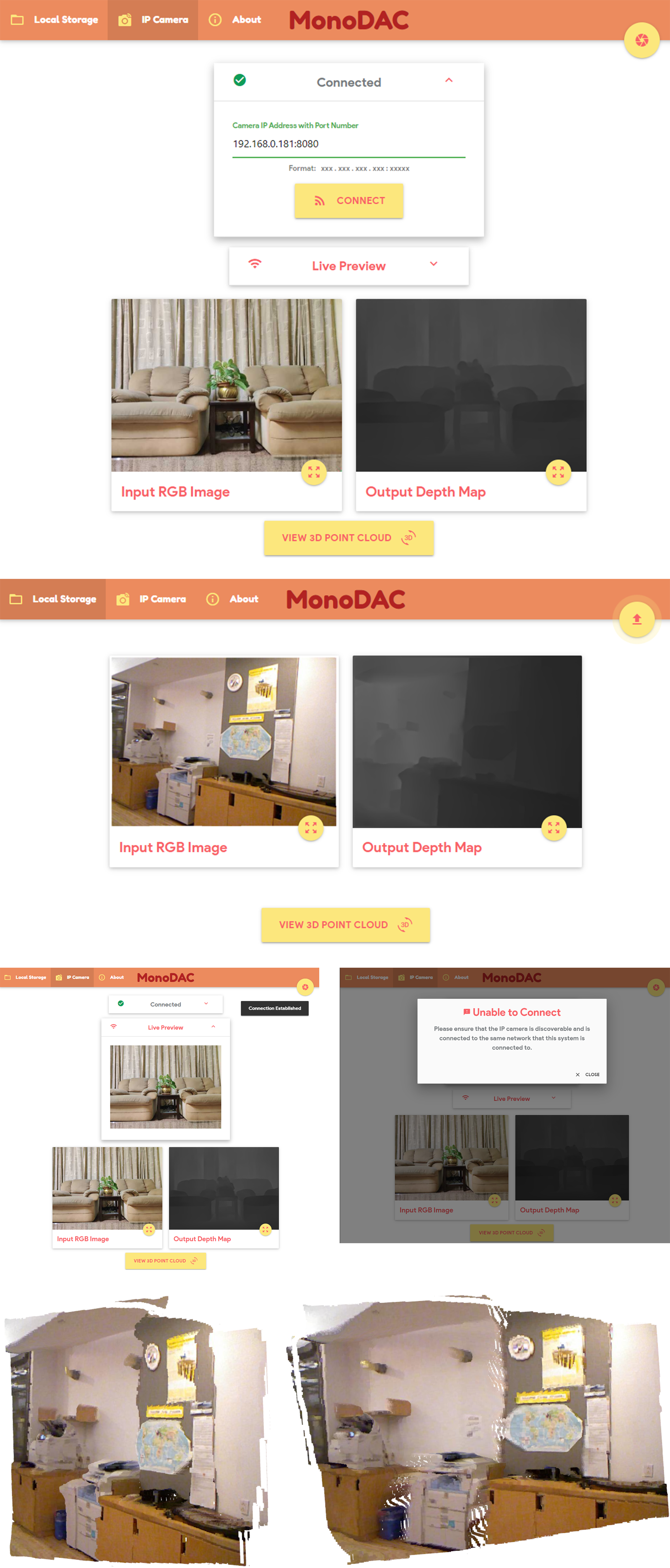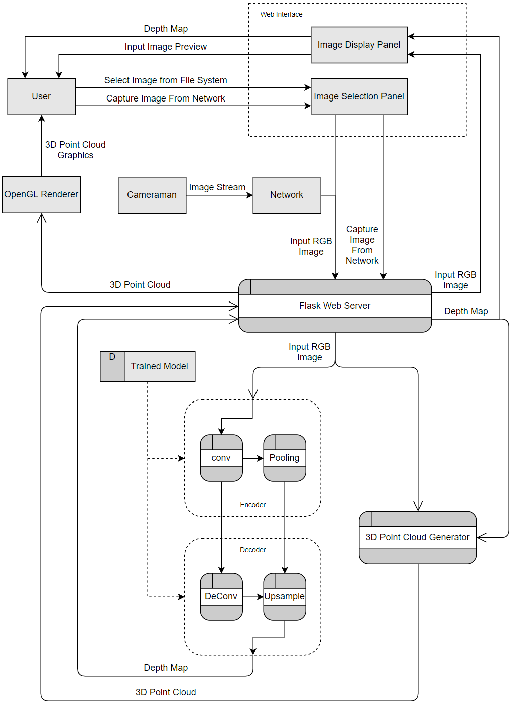 We are showcasing the results of our model using a 3D point cloud view, and have trained our model using a subset of NYUv2 dataset that contains RGB and depth map pairs, which were constructed using Kinect sensors in an unsupervised manner.