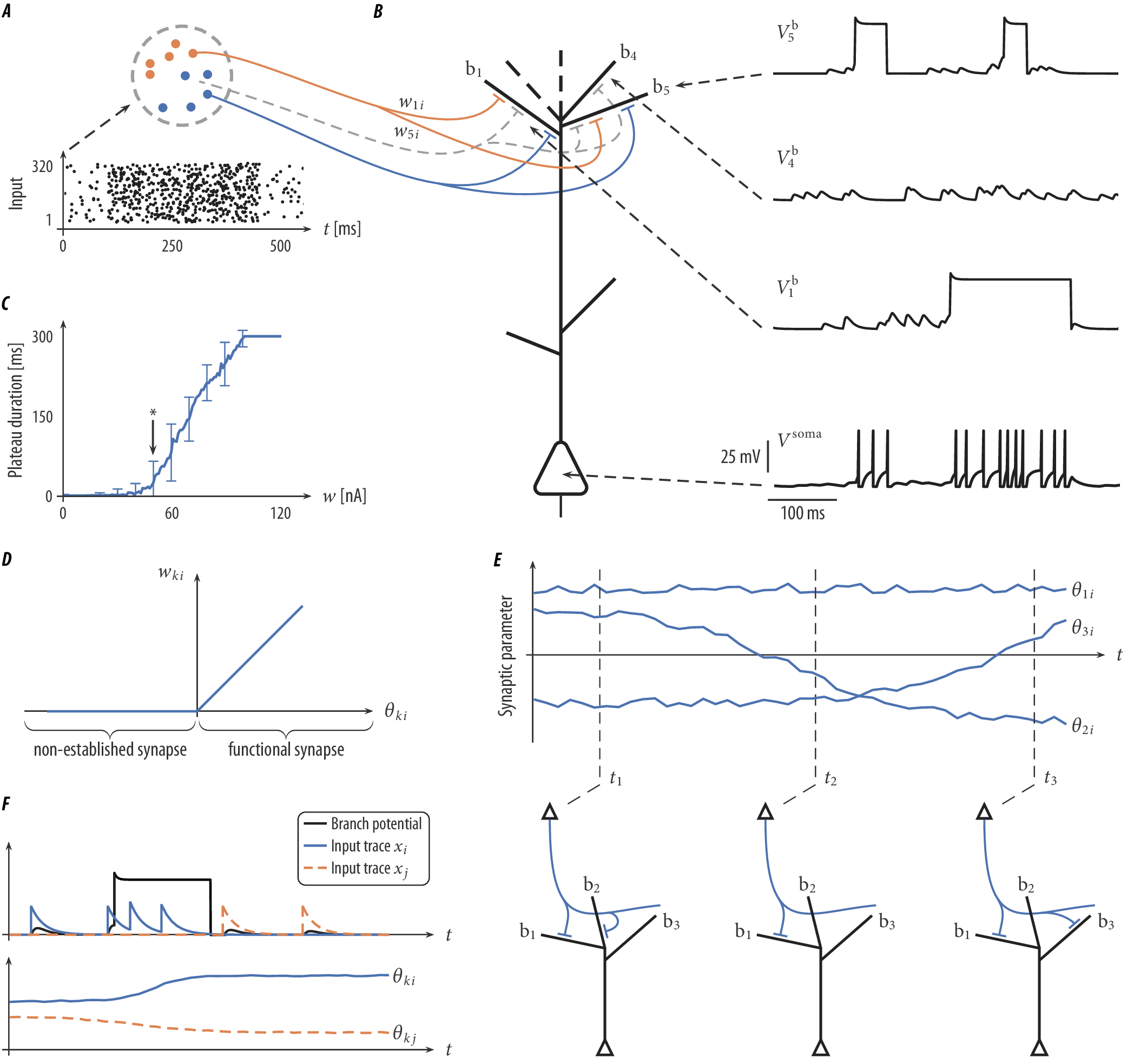 In our model we considered dendritic branch dynamics including a stochastic firing threshold and dendritic spikes where the shape of the dendritic spike is given by a brief sodium spikelet followed by a plateau. We hypothesized that this nonlinear integration of synaptic input and dendritic plateau potentials are crucial for synaptic clustering in our model. In order to verify this, we conducted simulations of an altered model with linear dendritic integration (i.e., we removed the firing threshold and did not model dendritic spikes). Our simulations indicate that the extended depolarization of dendritic plateau potentials is necessary to collectively strengthen correlated inputs which eventually leads to synaptic clustering. To reproduce the raw results reported in the paper, run python sim_rewiring_ex8.py (default parameters will be parsed from config_rewiring_ex8.yaml). To plot the wiring diagram before and after rewiring run eval_rewiring.py and then run graph_rewiring_v1.py.