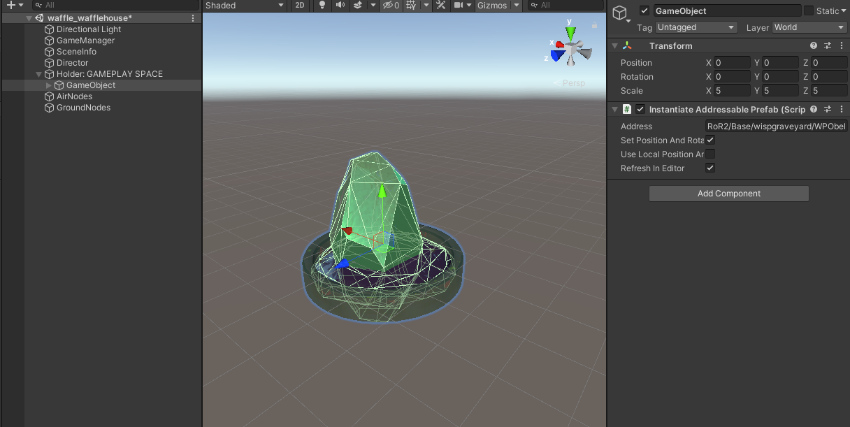 InstantiateAddressablePrefabscript that instantiates a RoR2 prefab into the Scene at runtime.Set Position and Rotation To Zeromakes the prefab have no offset; some RoR2 assets have offset, making it hard to set position or rotation.Use Local Position And Rotationwould make the prefab's position and rotation relative to its parent object.Refresh In Editormakes the prefab visible in editor; the prefab isn't saved to the scene to prevent GUID errors.AddressableInjectorscript that injects a RoR2 asset into a desired field at runtime. Select the component inTarget Component, pick theTarget Field, then fill in theKeywith any address of that type. It doesn't show the injected asset to prevent GUID errors, but it will be injected at runtime. A log will be produced when the asset is successfully injected.CameraInstantiatoris an editor only script that injects the RoR2 camera into your scene. This can be used to preview post processing. Building the scene with this script will have no effect in runtime.SurfaceDefInjectorquickly injectsSurfaceDefsinto anySurfaceDefProvidersattatched to any children.- A Geyser Menu item under