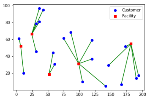 c = {(i, j): 1*np.hypot(xc[i]-xf[j], yc[i]-yf[j]) for (i, j) in A}