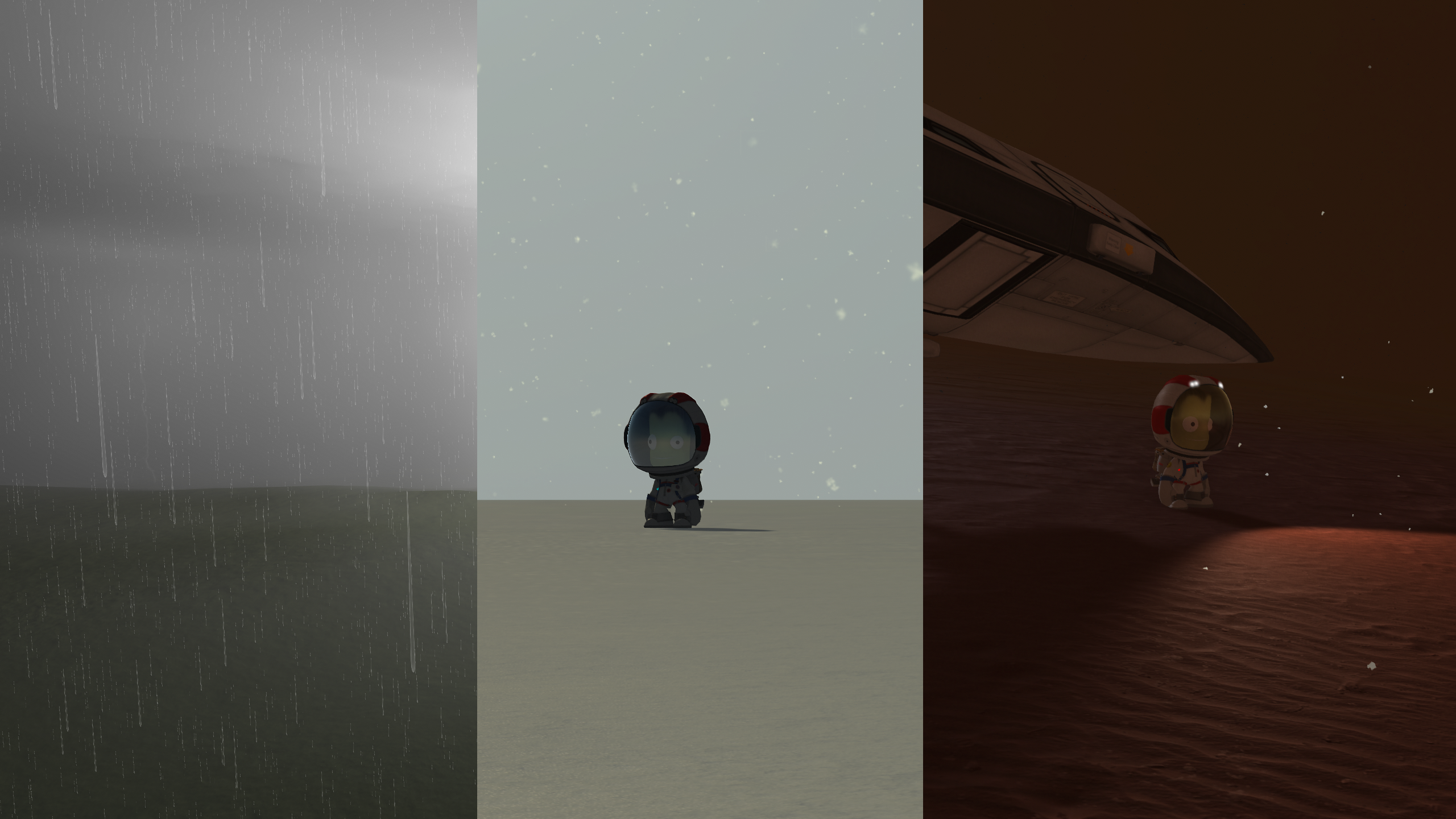 Particles can be made to stretch in their movement direction, this is perfect for making rain. When the craft is moving they will stretch more in the opposite of the craft's movement direction. Splashes can also be added for contact with surfaces.