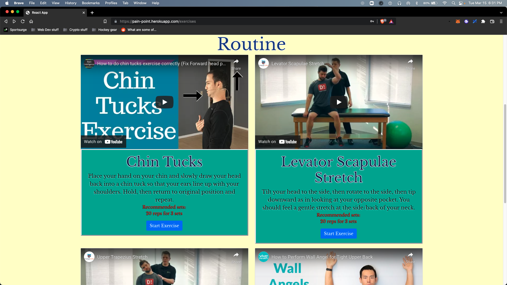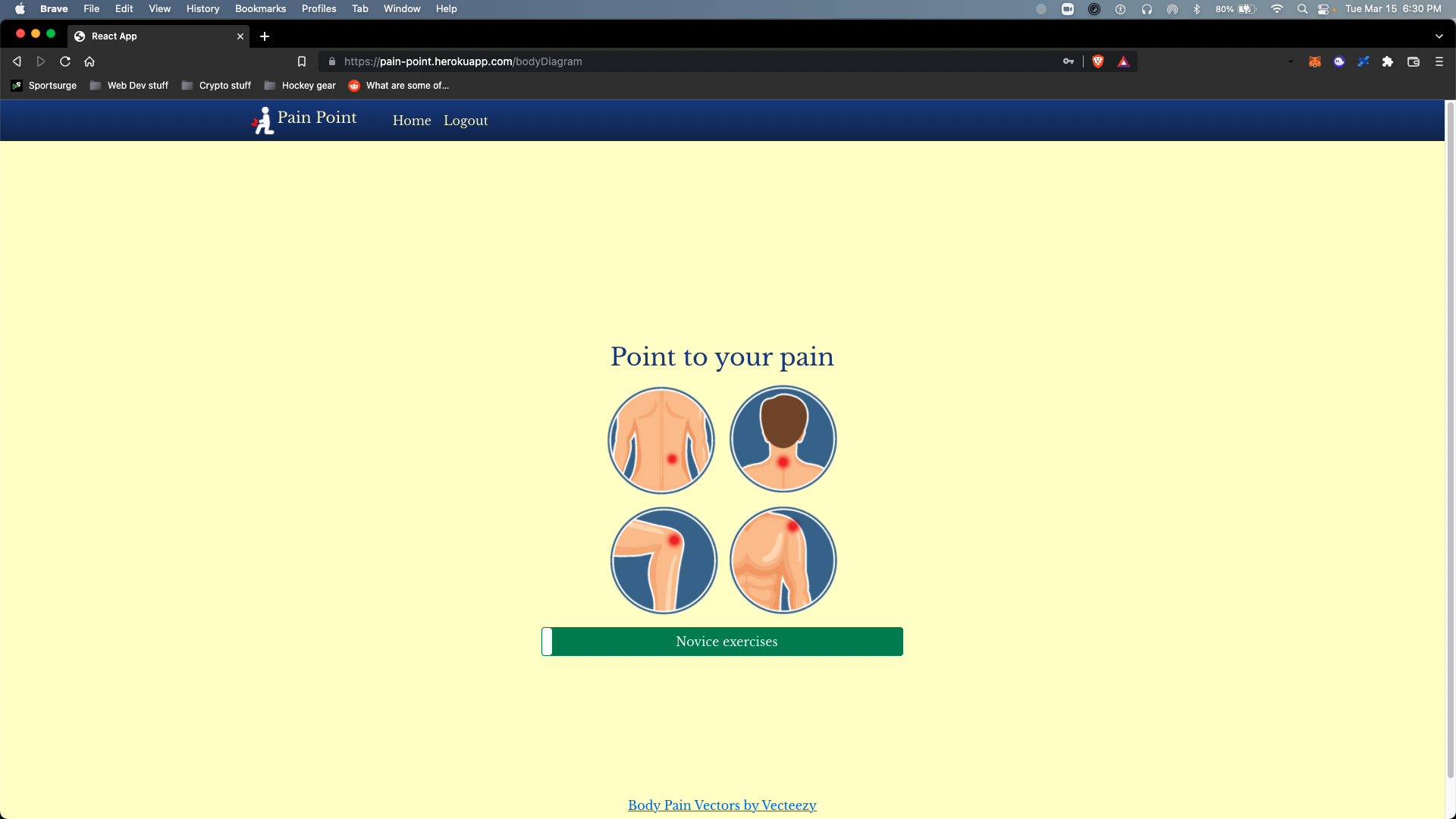 This project is an attempt to provide a learning resource to help avoid the most common pain sites I dealt with during my tenure as a physical therapist. The design goals of this website were to make a responsive website that could be sent to your mom,dad,grandparents or anyone else who you feel might need a set of physical therapist approved exercises to avoid common injury. This design choice led to bigger buttons, a cool color design theory to improve user trust and simpler layout for ease of use.