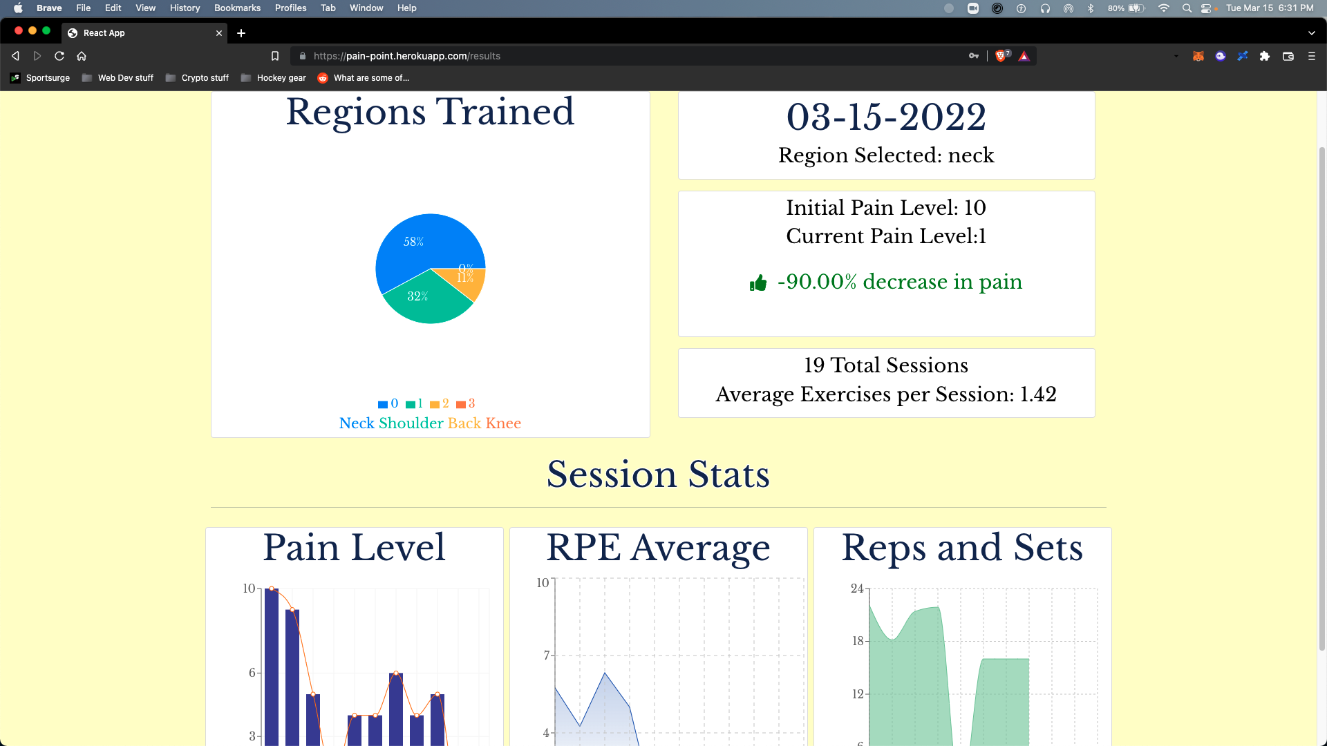 Dynamic Charts that demonstrate Pain level improvement over sessions, Average Sets and Reps, and Average rate of perceived exertion