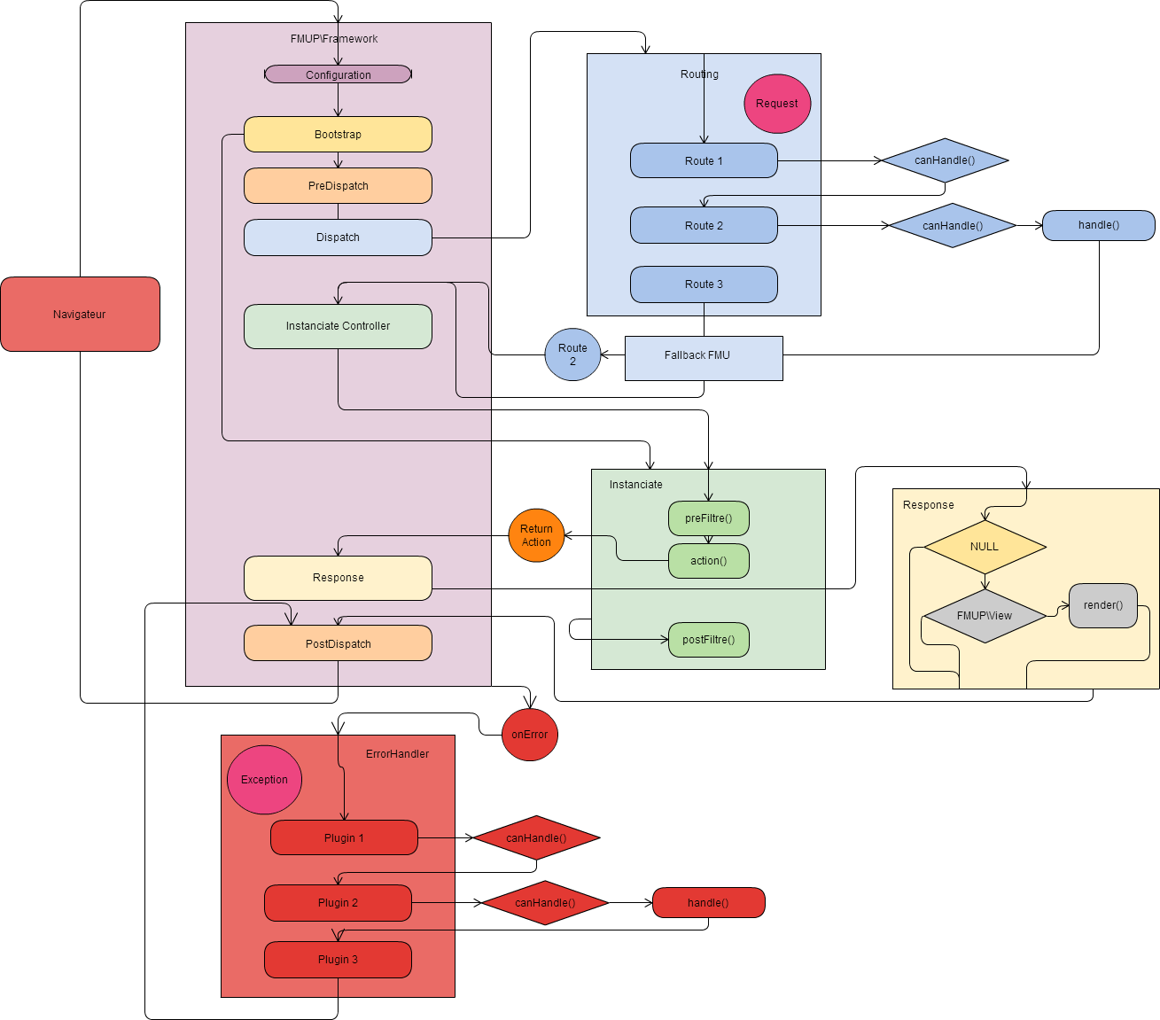- Si la requete match avec une regle de routing, la boucle s'arrete et l'on va instancier le bon controlleur. Dans le cas contraire, l'on passe par le fallback de FMU qui va essayer de trouver le controlleur/action dans le dossier application. En cas d'echec, la page 404 est appelée selon la règle FMU.
