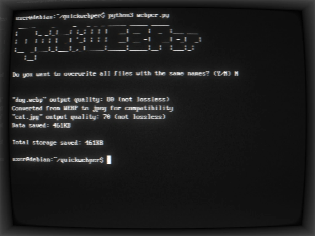 webper.run_module([file.jpg], False) # array of filenames, boolean switch to allow/disallow overwriting