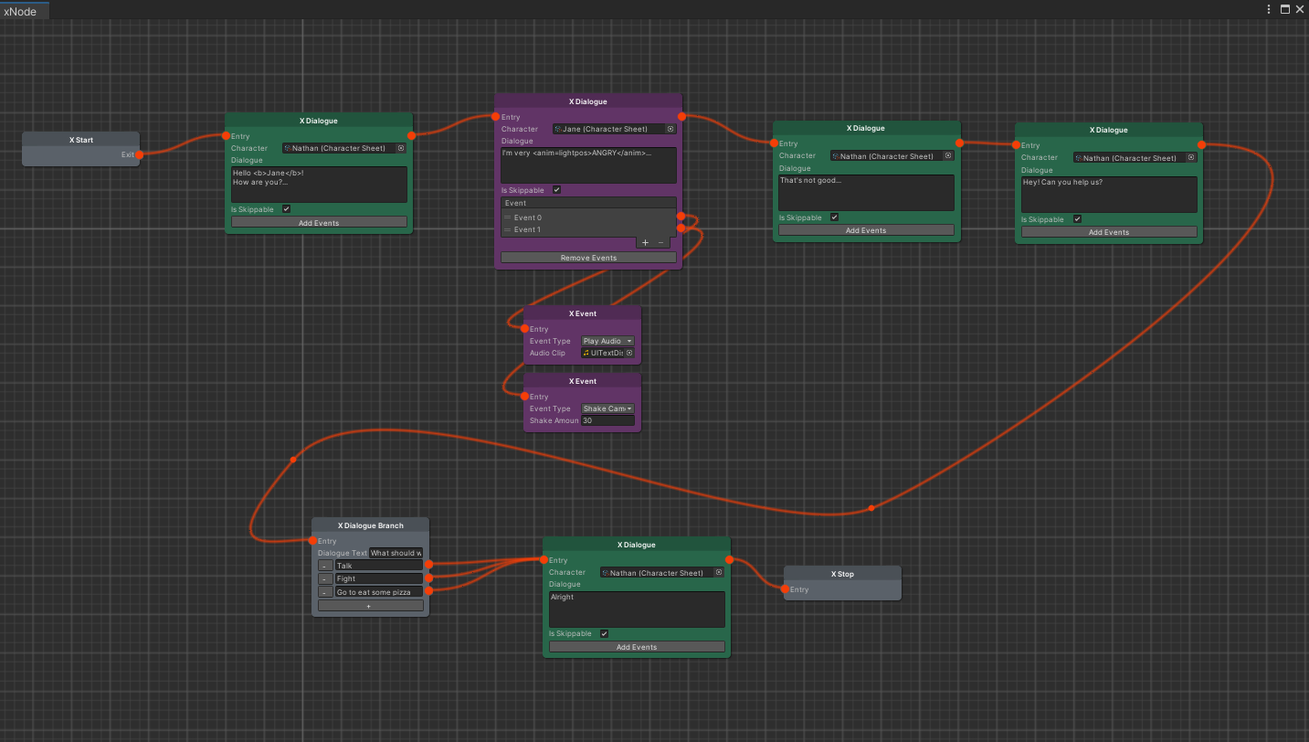 BranchingDialogueGraph Unity tool to create and easily customize dialogues for any game. Making use of xNode Features Simple and easy interface Supports any number of characters Dialogue branches Custom events (Audio, Animations,...)