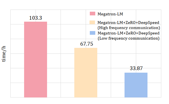 We build GPT2 on Megatron-LM as the baseline, use DeepSpeed engine to add ZeRO optimized memory management, and use General, GPU specific, and ZeRO optimizations. The training time required by different methods is shown in the Figure. Our final traning time is 66.75h. The reason why we did not reach 33.87h is explained below.