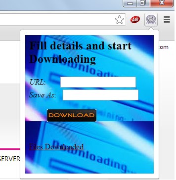 When popup.html is opened it calls the address of server requesting file Welcome.php, it also defines the size of popup that is going to be open.Now at server side script welcome.php comes in role, which displays the background image of popup, two text fields one for URL and other for File name under which data is suppose to be save, one submit button with name download on it, one link for accessing all the files that are already present in server.
