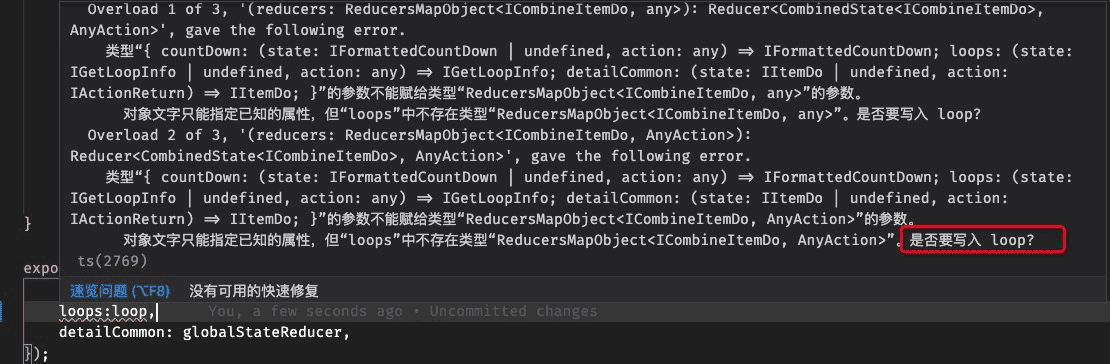 如图,首先我们需要将 combineReducers 和 state 通过 type 进行约束。当这个约束建立的时候,那么就可以通过这个 type 来进行 config 字段的约束