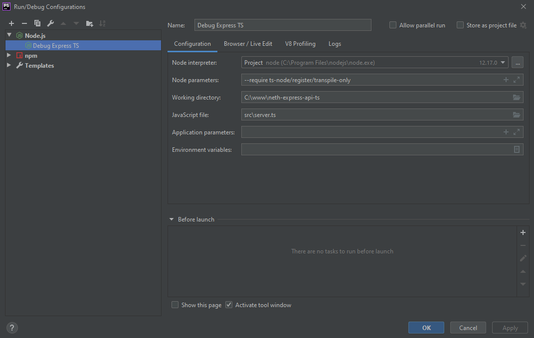 $ npm run test:coverageTo debug TS without compiling it, you can setup your IDE of choice as in the example below
