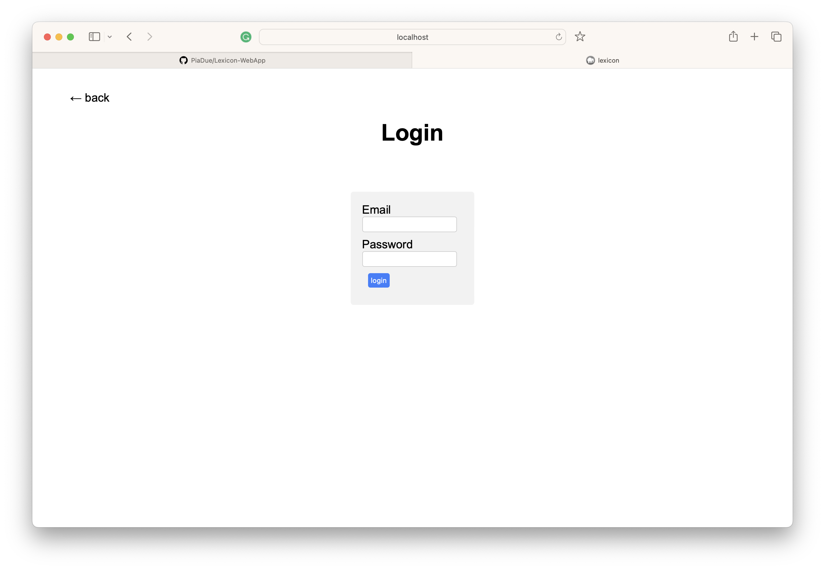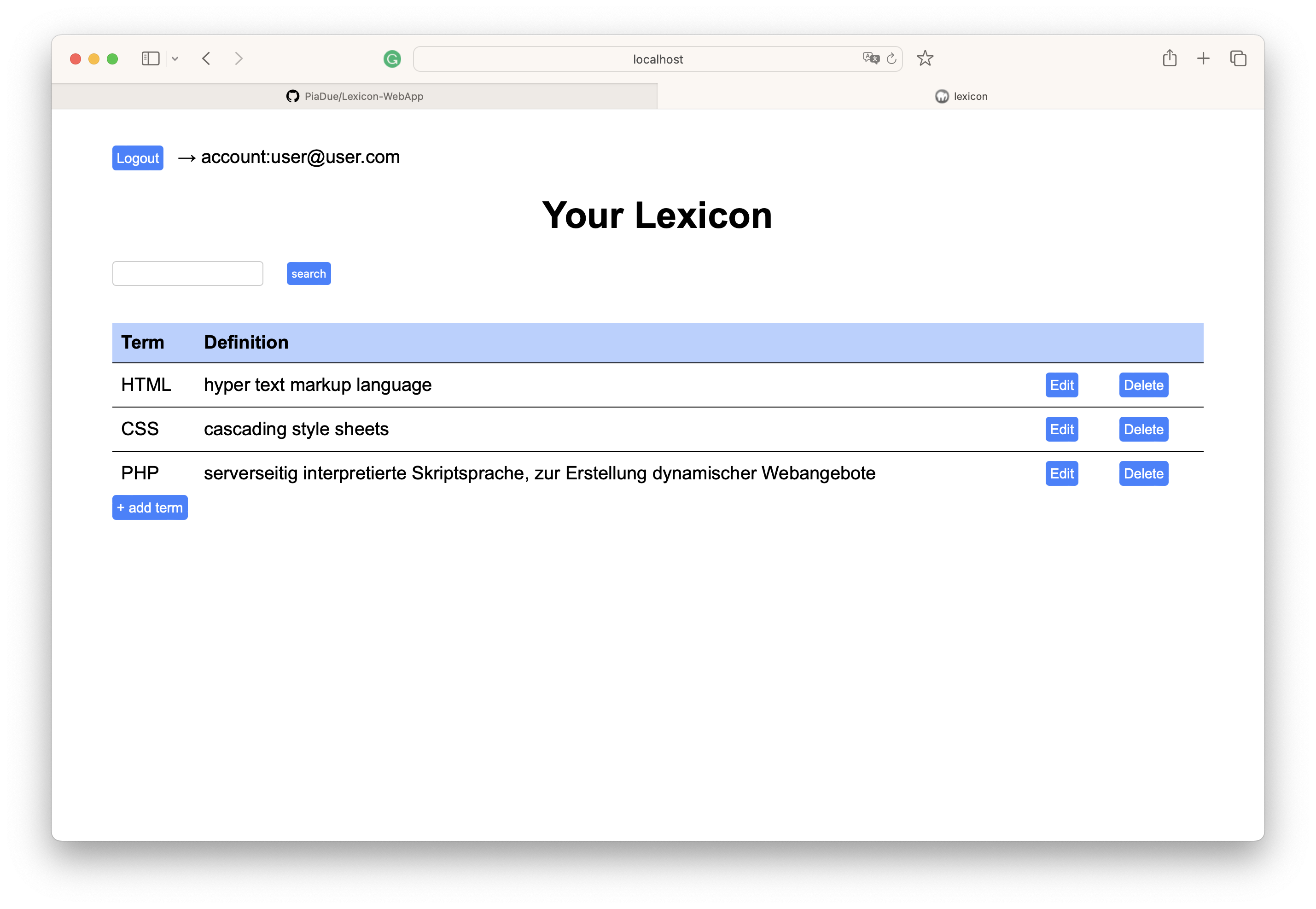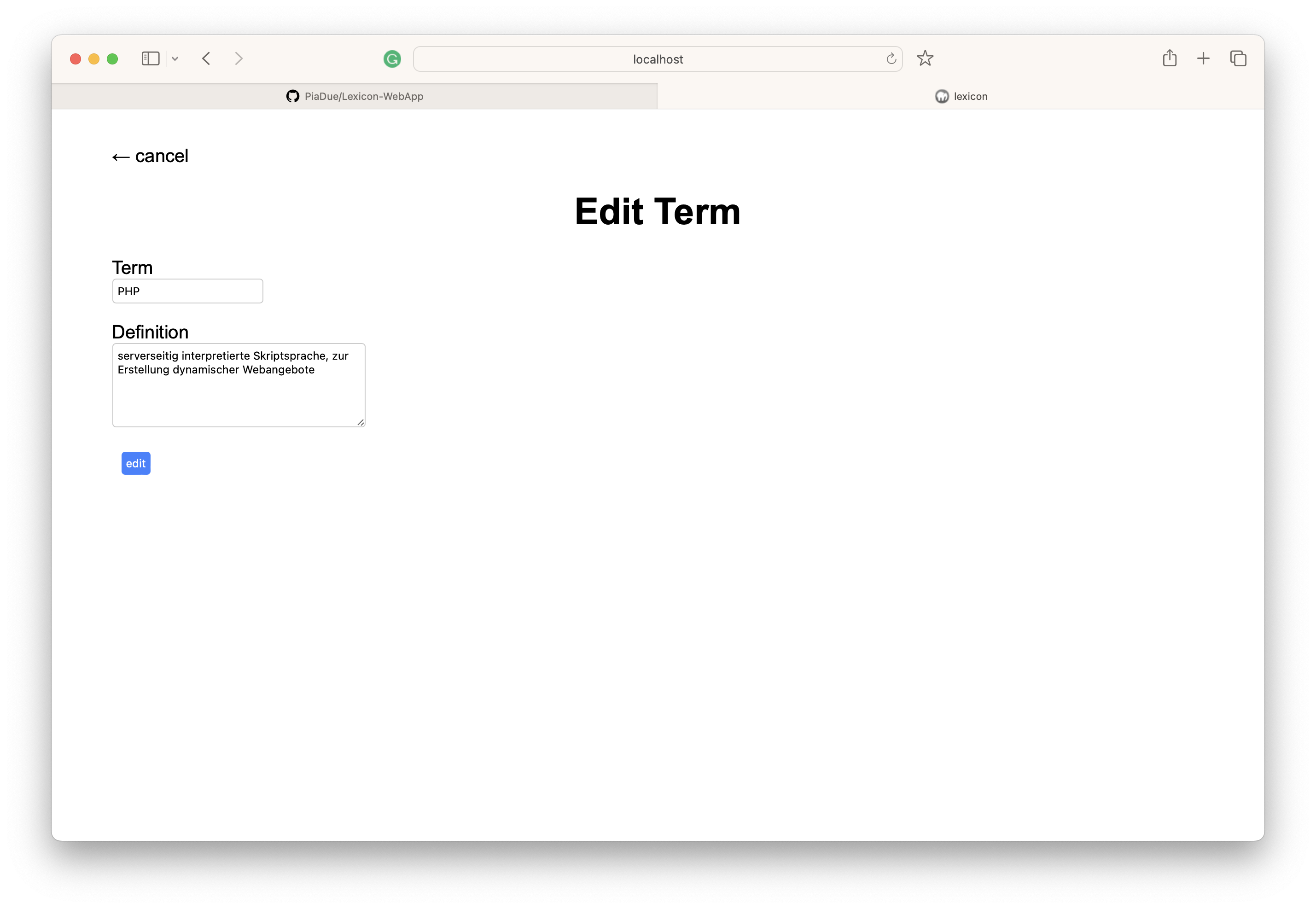 Lexicon-WebApp Project was part of a php course Features lexicon overview search function detail page for each term admin mode login and logout create new term-entry edit term-entry delte term-entry Planned Features moving admin login data to MySql DB register for new admins Screenshots start-page without a loged in account login-page start-page after login add-term-page edit-term-page delete–term-page