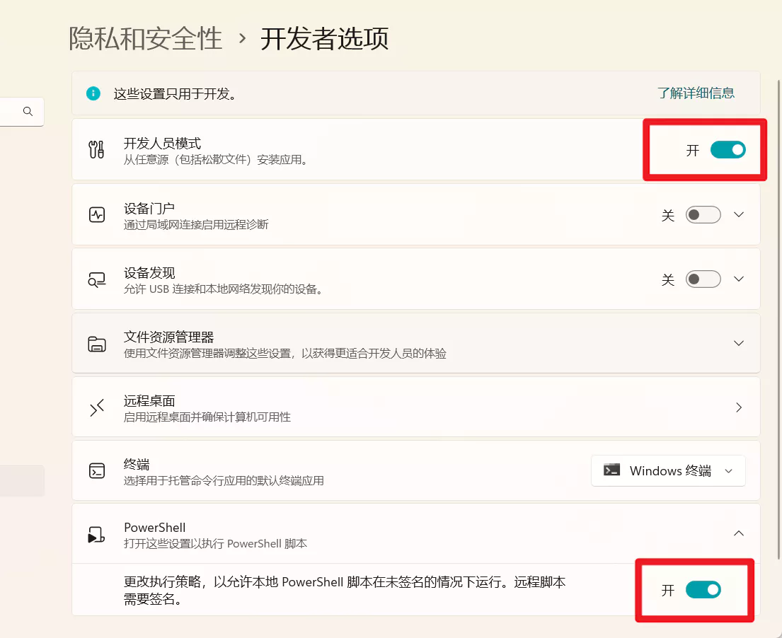 开发人员模式和允许 PowerShell 脚本 - 找到