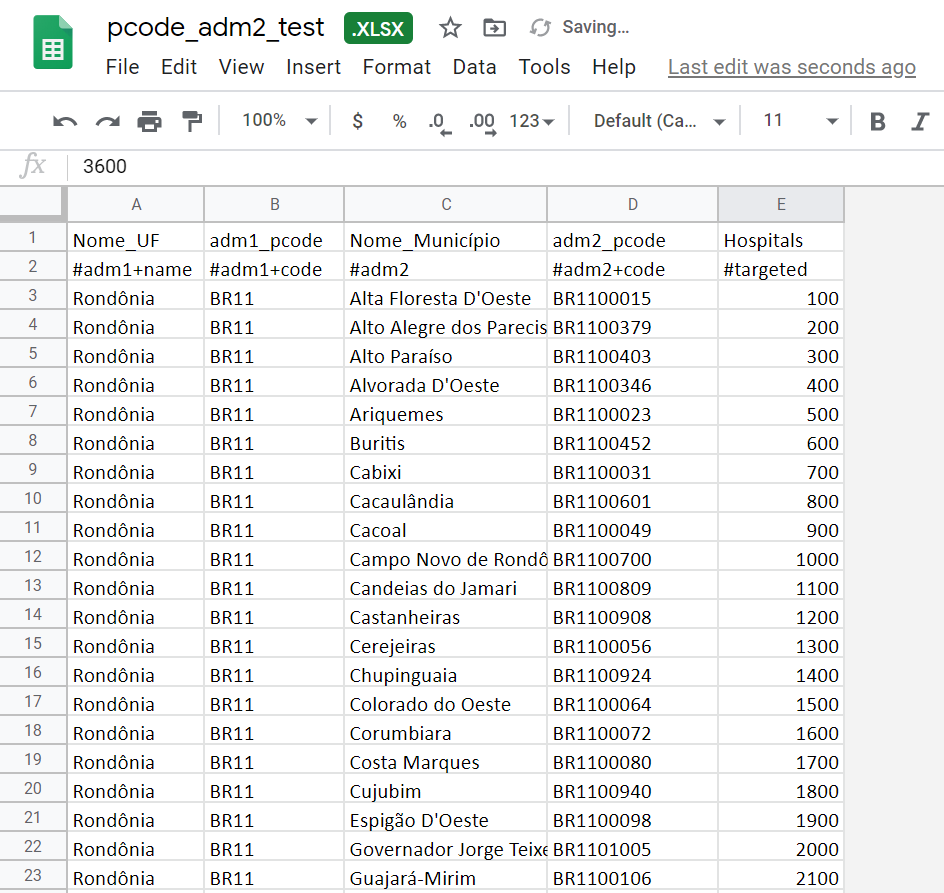 This dummy data consists of admin 1 and admin 2 levels with a random number of “hospitals” in each region. The 2nd row contains the **required ** HXL Tags for HXLDash. Make sure you have #adm1+code and #adm2+code, etc.. for the columns with p-codes.