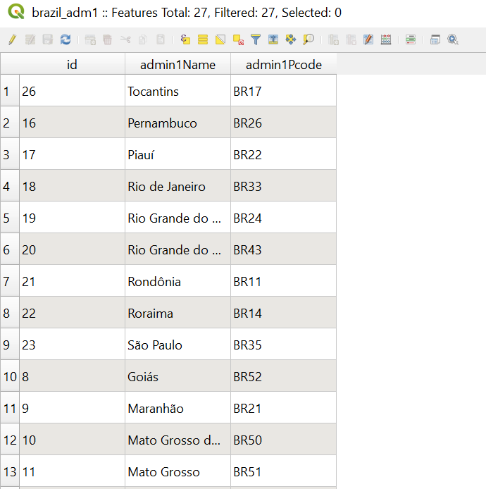 An an example below, we see the attribute table for the Brazil admin level 1 TopoJSON file in QGIS: