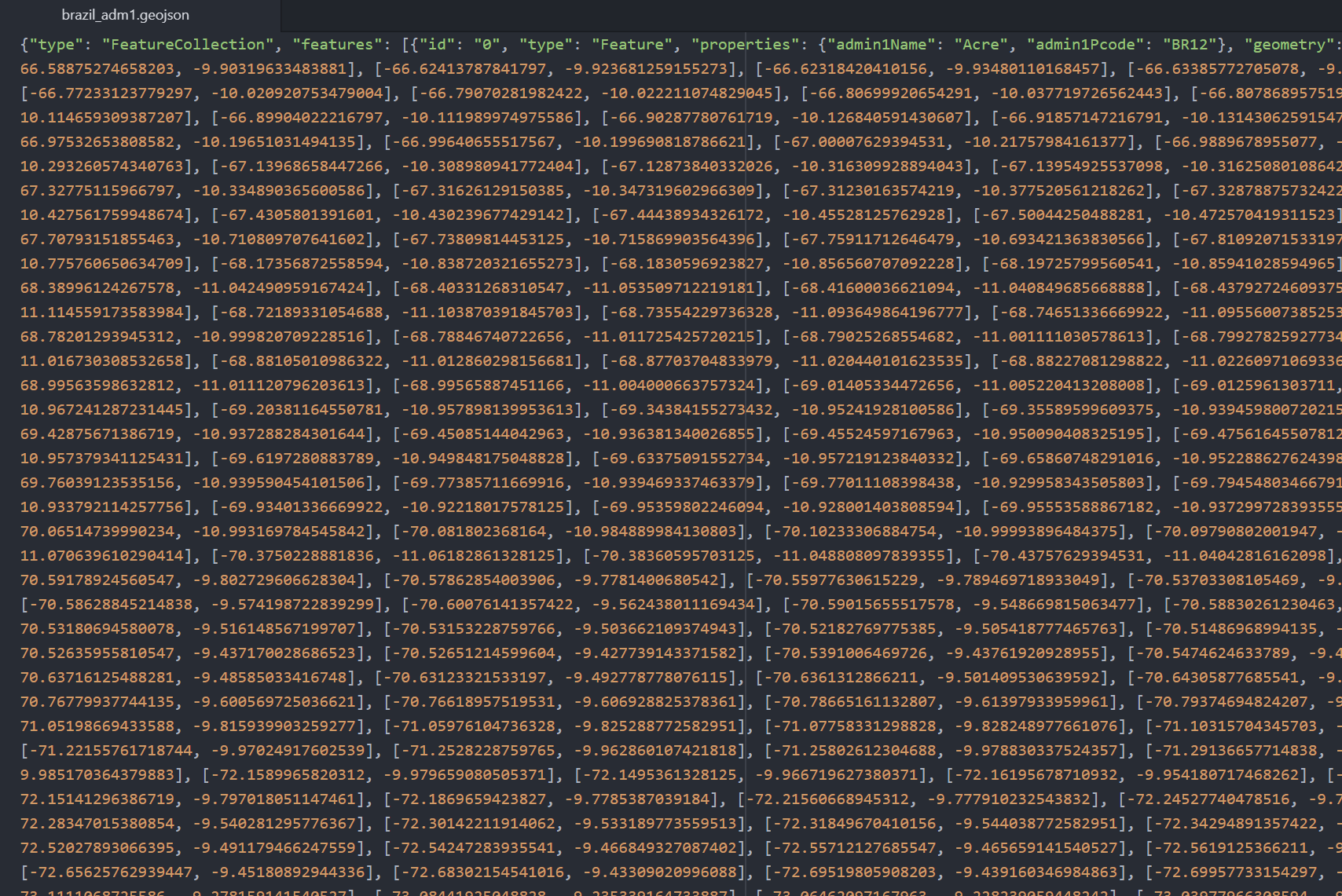 When looking at the same dataset as a .JSON file in an application such as Atom, we see that is it a collection of features (each administrative area) with corresponding spatial points: