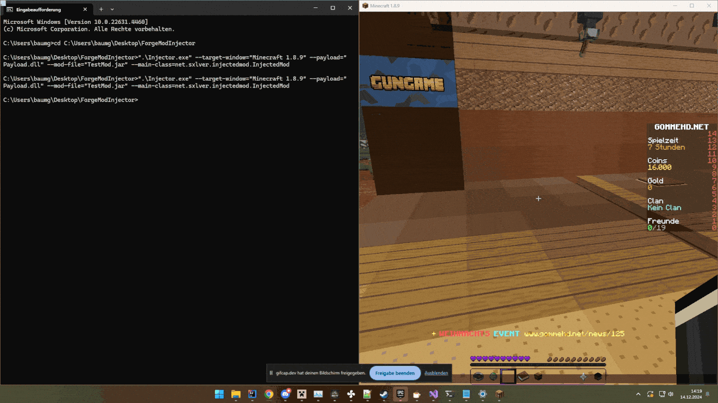 <Minecraft Process ID>with the PID of the Minecraft process and with the full path to the DLL Payload file. -
