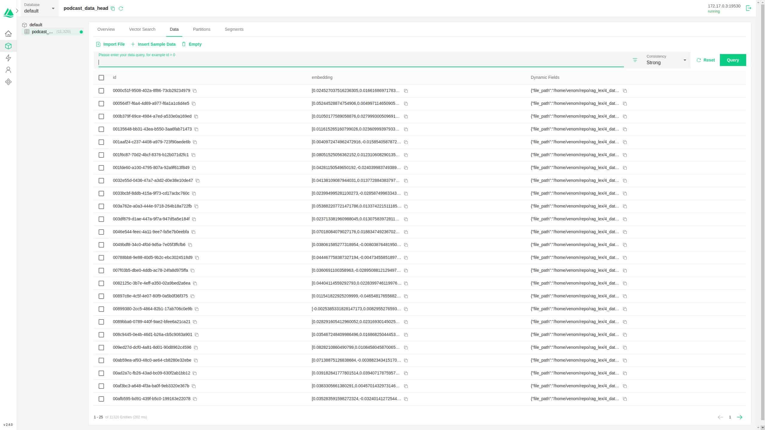 Now, I can ingest the data into the VectorDB. Please note that this step is a one-time process, and using a GPU at this stage is recommended. CPU-only ingestion takes a very long time. On my laptop (with RTX 3060), it took ~5 minutes. On CPU, the estimated time was ~4 hours (i7, 8C 16T CPU). The script to ingest the VectorDB from the generated JSON files can be found here - ingest.py.