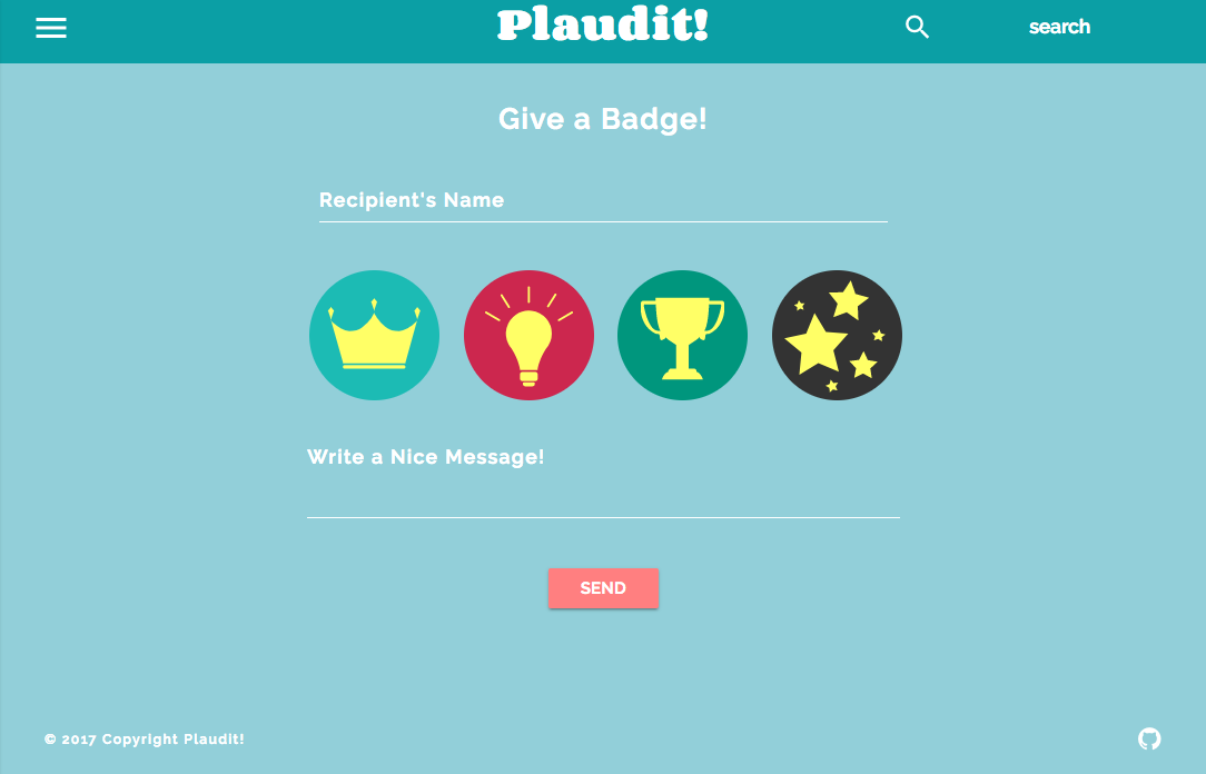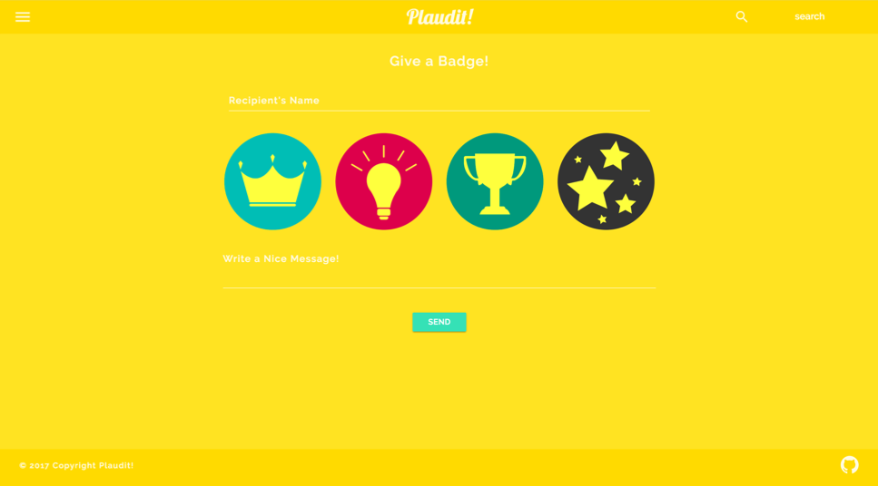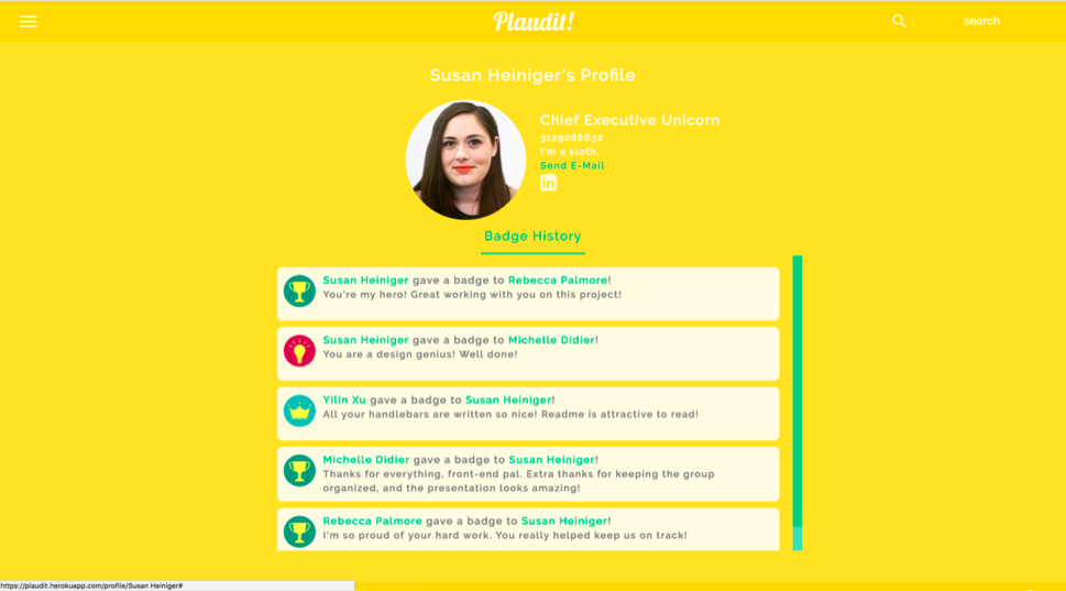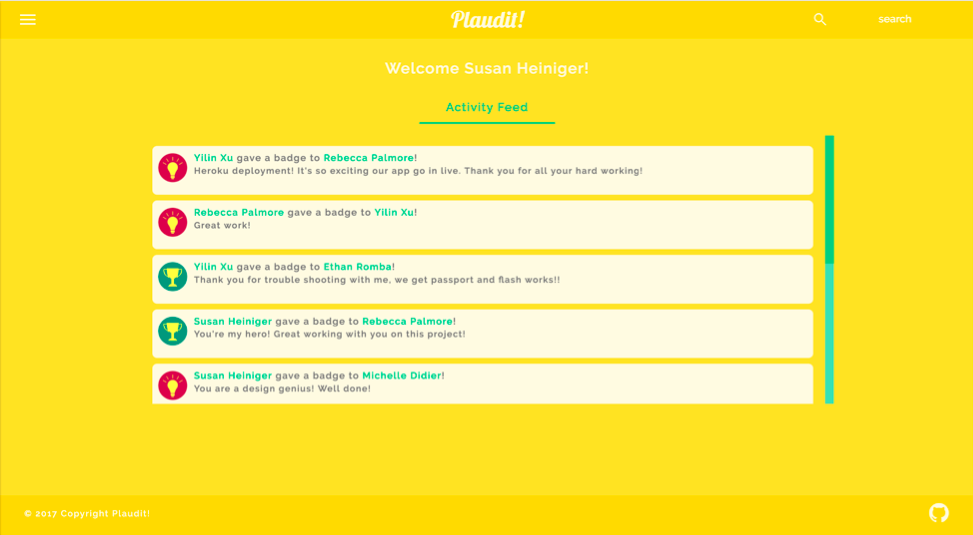 We recognize that each organization is unique, so we designed Plaudit to be highly flexible for customization. The information on each user's profile page can be tailored to include extra information (currently we feature a 'fun fact' about each user), and the color scheme can be altered to match an organization's image and brand. Additionally, the current 'badge types' we include are very simple, but an organization can choose to use different icons and/or declare meanings for each type of award - for example, a company may choose to include awards at different tiers (a small award for cleaning a supply closet, a giant award for working 36 hours straight to finish a massive product launch), or simply categorize the awards to fit their own unique style (a 'great idea' award, an 'extra effort' award, a 'helpfulness' award, etc).