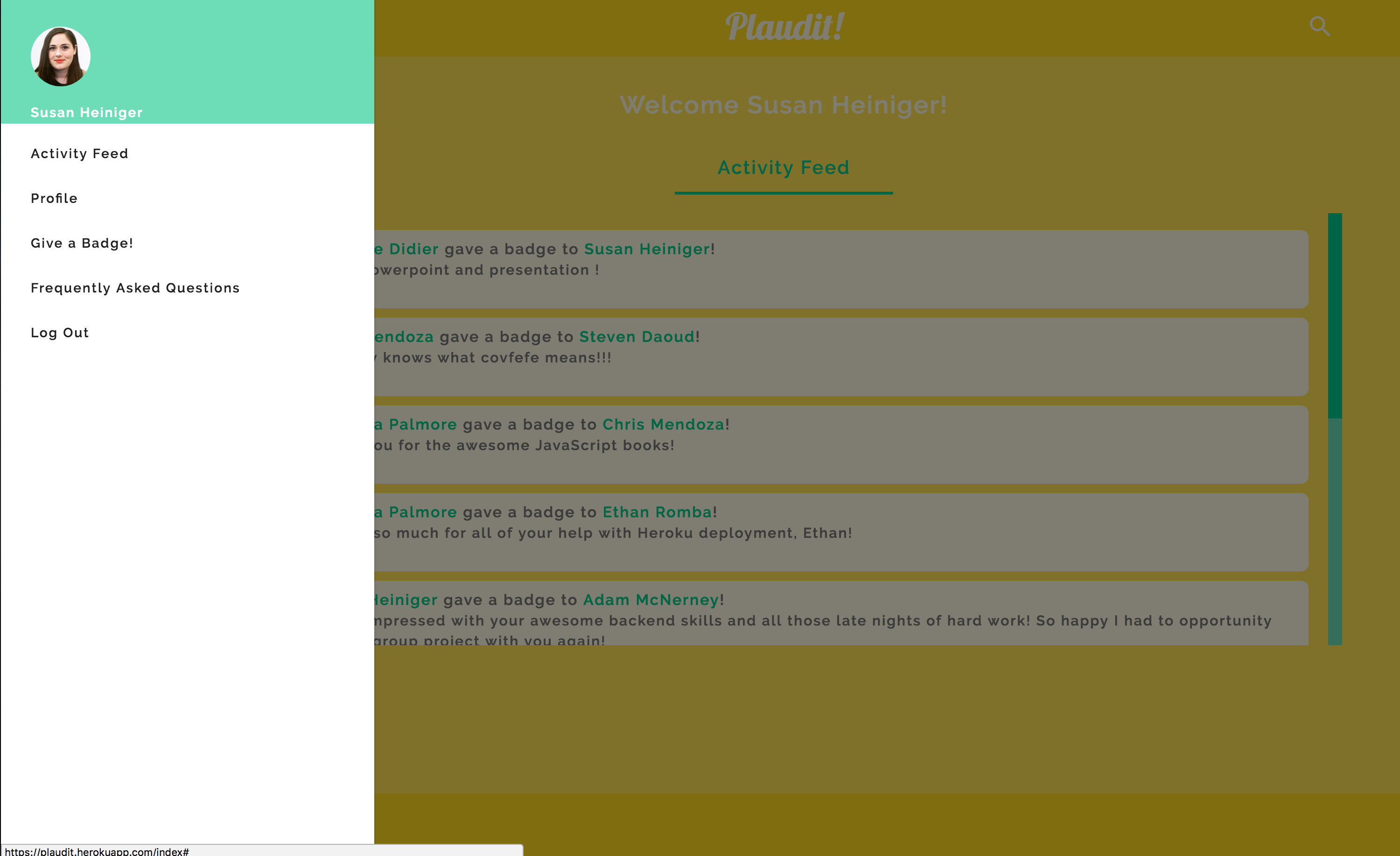 One can search for other users using the search bar. It will take the user to that person's profile page. The hamburger menu, once clicked, will trigger a side nav to slide out from the left side of the page. Users can navigate to the main activity feed, their profile page, the give a badge page, or the frequently asked questions page. Users can also log out from the side nav.