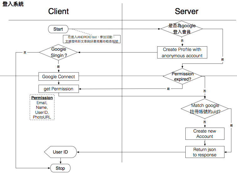 登入系統主要用Google 帳號登入,目前將不提供emai與faacebookl註冊。為了使用者在登入之前就可以使用站上功能,使用功能之前會先得到匿名帳號,待使用者用google登入之後才整合至登入帳號。 點選Navigation Bar的登入之後跳入Dialog顯示google登入按鈕  然後登入邏輯流程