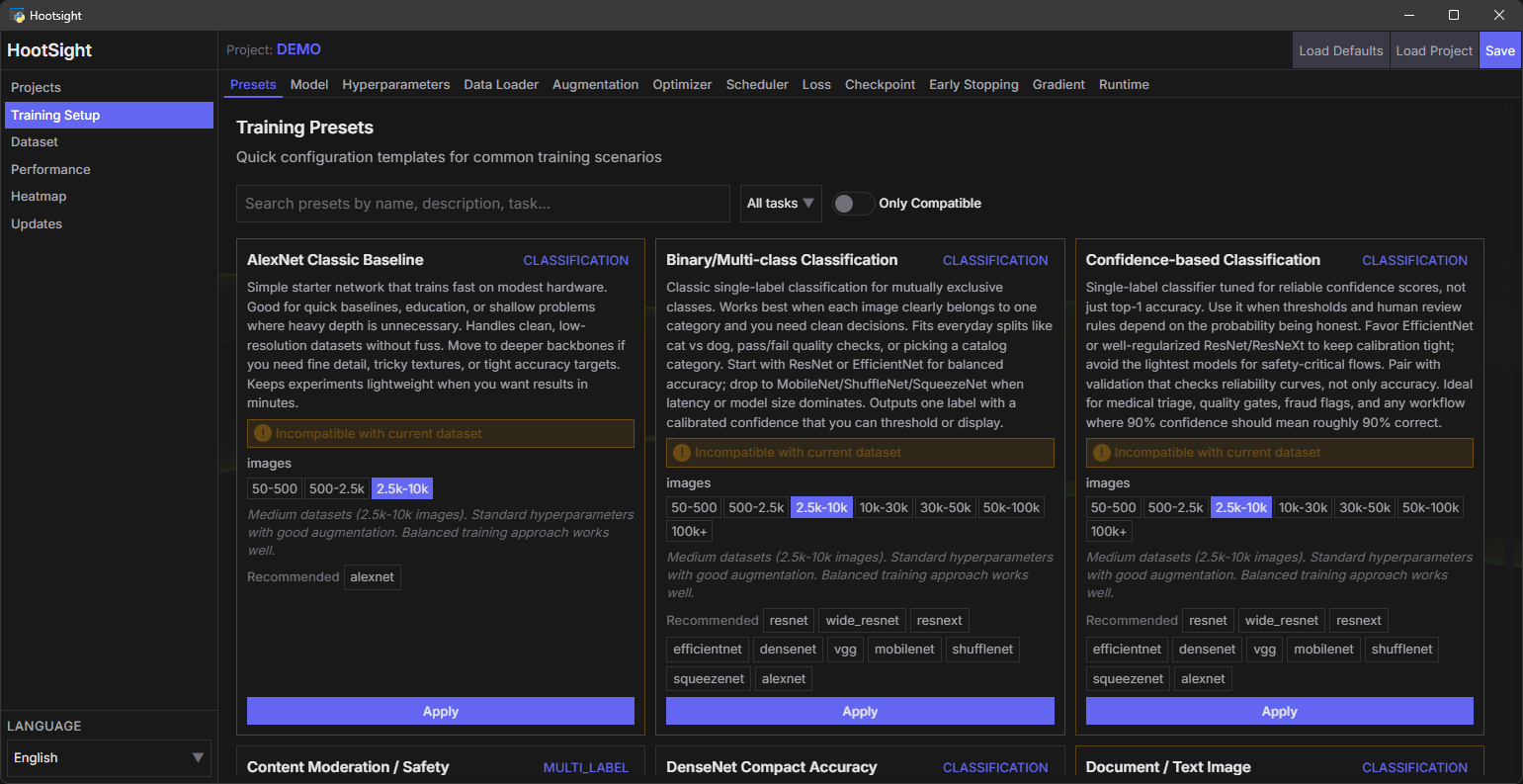 HootSight is in active alpha development. The core training pipeline is stable and battle-tested on ResNet architectures, while other model families (ResNeXt, EfficientNet, MobileNet, ShuffleNet, SqueezeNet) are in ongoing validation. I'm continuously refining the memory management, augmentation preview system, and multi-label workflows based on real-world usage.