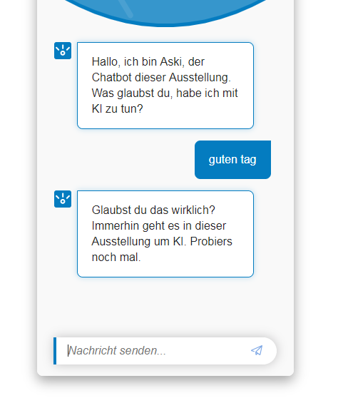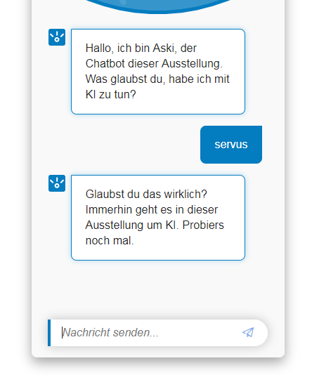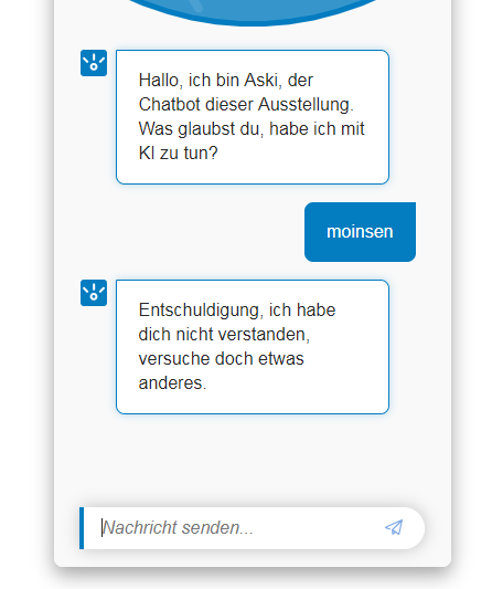 Noch keine passende Antwort, wenn der Besucher aus irgendeinem Grund die KI auch begrüßt. Probiert habe ich es mit Hallo, Grüß Gott, Guten Tag, Guten Abend, Guten Nachmittag, Guten Morgen, Hi, Hey, Servus, Moin, Moinsen, Mahlzeit. Hier ein paar Beispiele