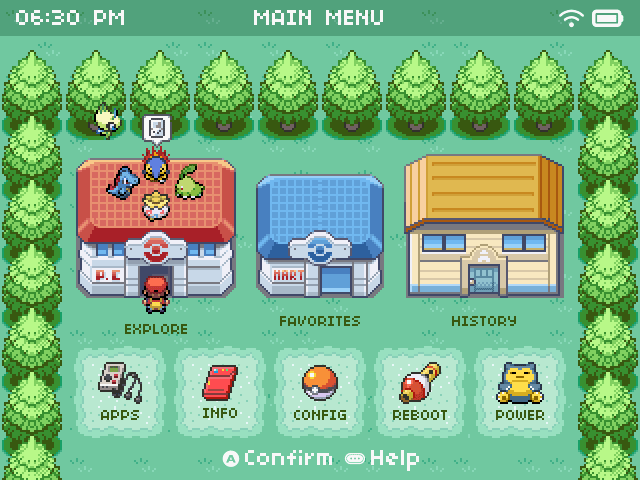 JohtOS is a theme for muOS inspired by the JOhto region of Pokémon. It was built using a combination of custom and original sprites from the Pokémon games. The font is 04b_03 created by Yuji Oshimoto.