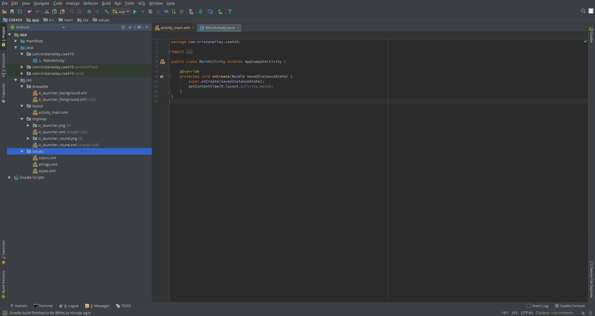 Now let's look at our files. On the left you'll see a java directory and a res directory. In the java directory we'll put all of the logic for our program, as well as some premade tests. Each activity's code will be here.