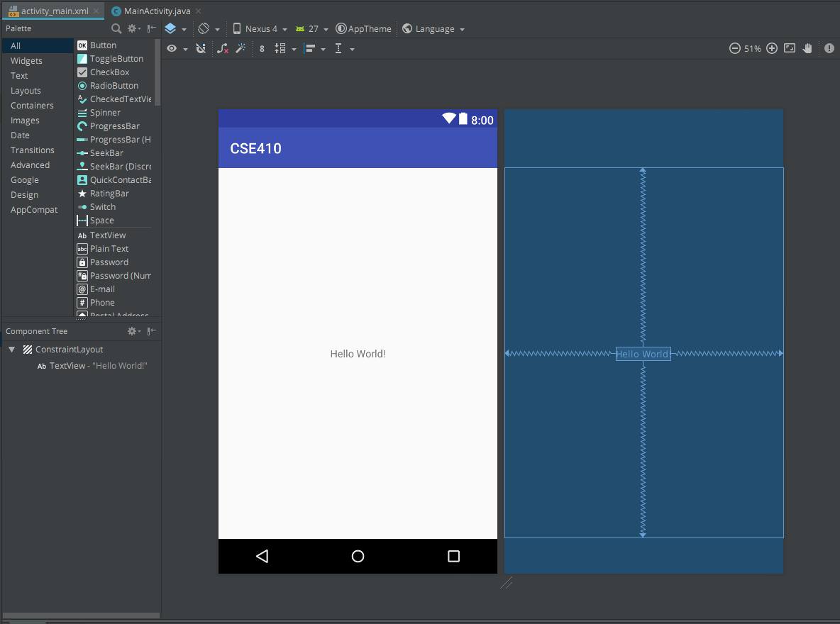 Below the Pallete we see a "Component Tree", this shows us what's in our current Activity. We have a TextView inside a ConstraintLayout. The ConstraintLayout is a new layout from Google that allows all elements to be constrained in the view somewhat relative to their surroundings.