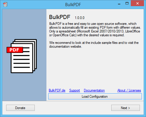 BulkPDF is a free and easy to use freeware software (Open Source), which allows to automatically fill an existing PDF form with different values. Only a spreadsheet (Microsoft Excel 2007/2010/2013, LibreOffice or OpenOffice Calc) with the desired values is required. BulkPDF.de
