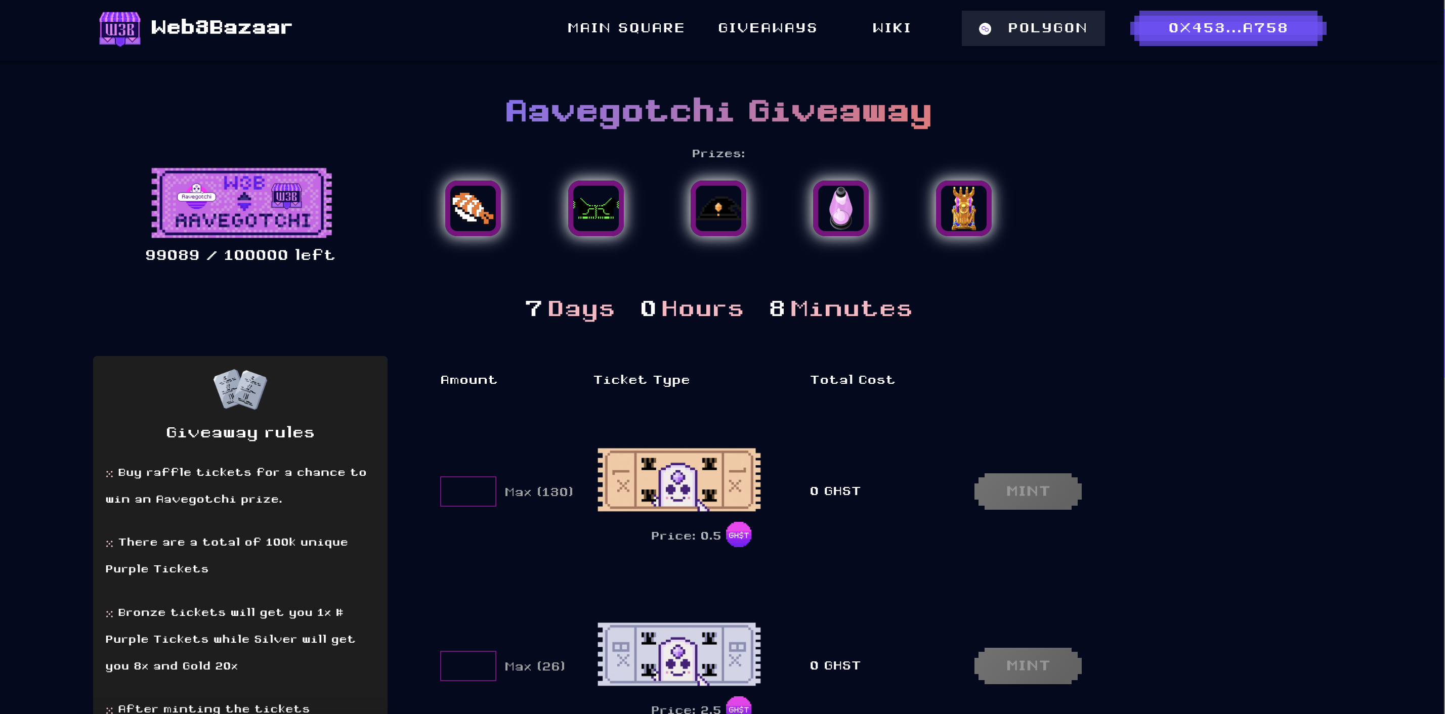 The Raffle Ticket Protocol is a smart contract that lists NFT-based lotteries based on parameters preset by the creator. It as an open source tool that allows everyone to create their own lotteries with customizable supplies, ticket images and rewards. The contract is also connected to the Web3 Bazaar escrow smart contract, enabling a trustless P2P transaction for ticket buyers and reward claimers.