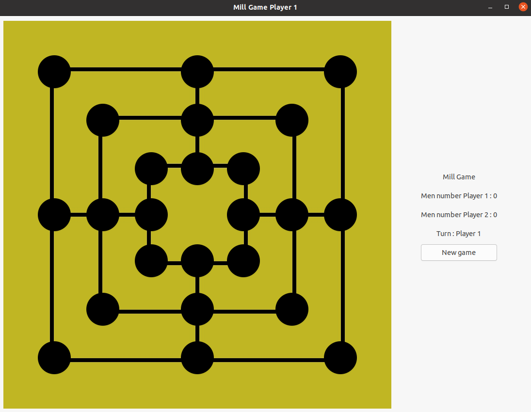 The implementation of a famous board game called "the mill game" (this game is also called "nine men's morris", "mill" or "merels").