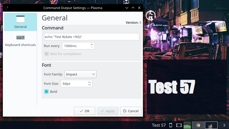 Command Output https://store.kde.org/p/1166510/ Run command every second and displays the output. A more advanced widget called Kargos can be found on the KDE Store. Screenshots License GPL-2.0-or-later