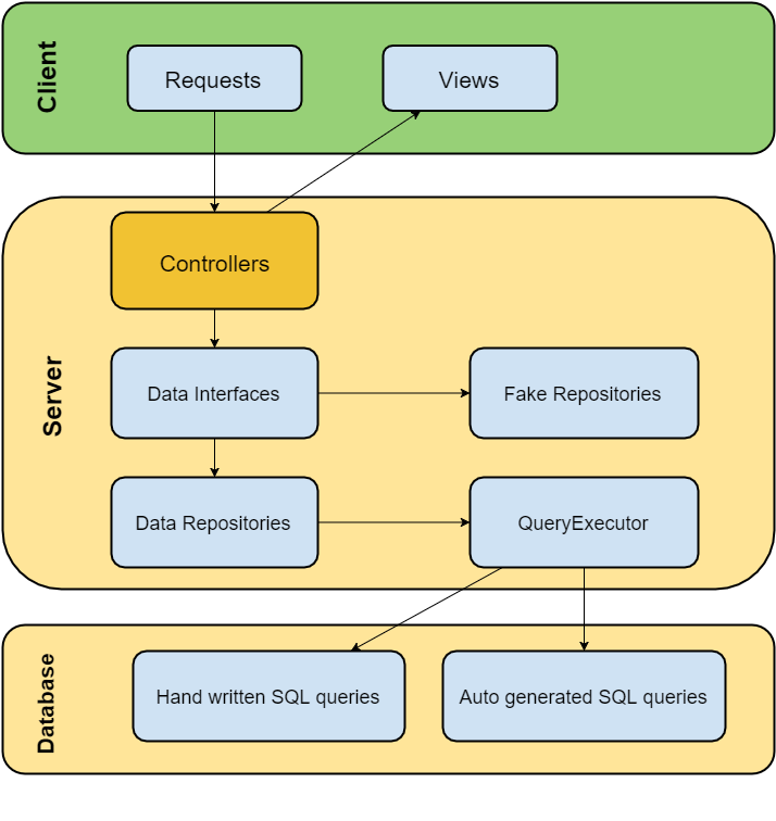 Controllers handle requests and calls methods of IDataRepository and IUserRepository interfaces. For developing front-end we used fake repositories(FakeDataRepository, FakeAppUserRepository) which works with data in CPU and uses LINQ to operate with data. In same time we were implementing true repositories(DataRepository, AppUserRepository) they call QueryExecutor which executes hand-written and auto generated sql queries. For simple models we didn't write queries, we developed AutoSqlGenerator for that case.