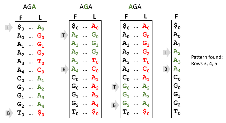 To find a pattern in bwt , back and forth walk through the inverted pattern in the first and last column. the pattern is matched if it reaches its first character in the last column. If the pattern fails to reach a match it returns -1, else, [ID, pos]