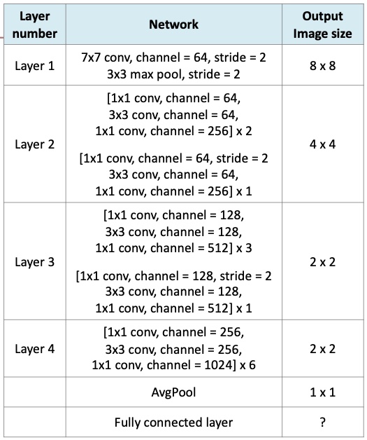 In this project a modified version of ResNet50 is implemented. The implementation follows the following table: