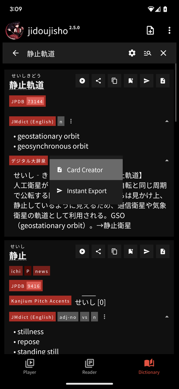 - 📋 Tap a word for instant dictionary lookups, and open the Card Creator or use Instant Export