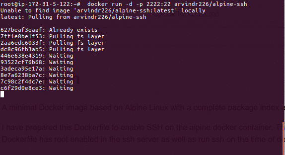 $ docker run -d -p 2222:22 ghcr.io/arvindr226/alpine-ssh:master